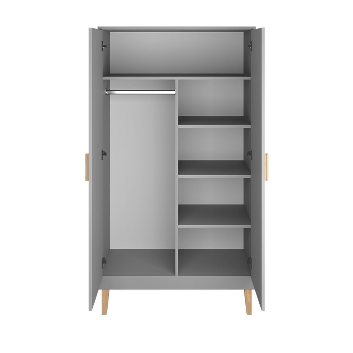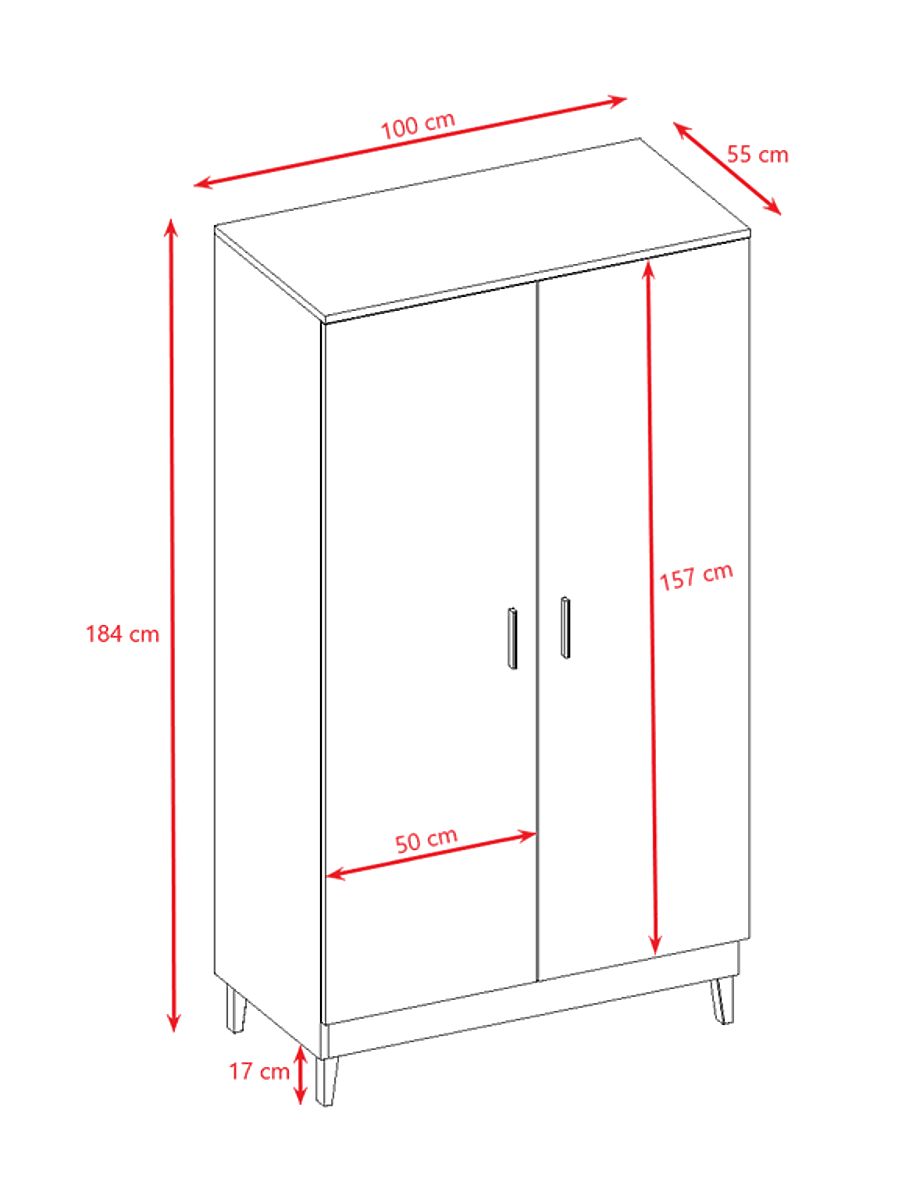 Szafa dwudrzwiowa zawiera 5 pojemnych półek , które rozmieszczone są w taki sposób, aby znalazło się w nich miejsce również na drążek na ubrania , na którym można powiesić wieszaki z ubraniami. Ergonomiczne uchwyty są stylowe i wraz z systemem cichego domykania poprawiają poczucie codziennego użytkowania tej szafki.
