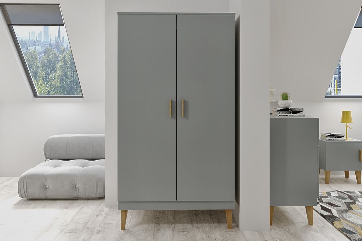 Nowoczesna szara szafa KUBI na nogach z litego drewna dębowego. Szafa swoim designem pasuje do pokoi dziecięcych urządzonych w stylu skandynawskim. Nadaje się do pokoi dziecięcych w każdym wieku, zarówno dla chłopców, jak i dziewcząt.