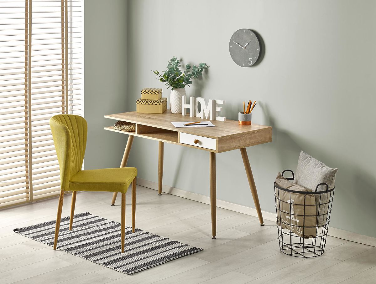 Blat roboczy i nogi biurka wykonane są z laminowanej płyty MDF w kolorze dębu sonoma i białym. Wzmocnienie biurka wykonane jest z malowanej proszkowo stali.