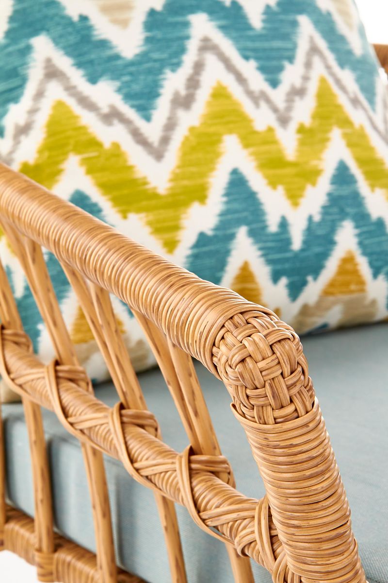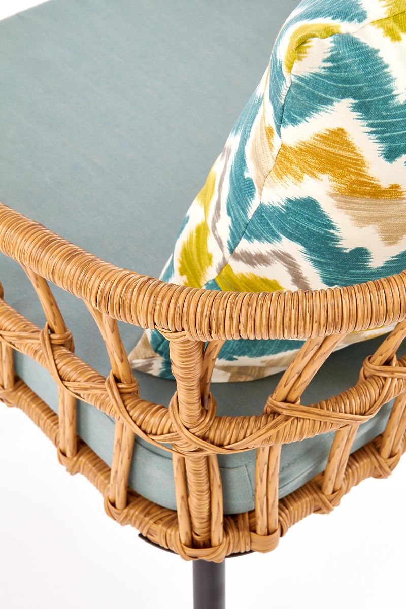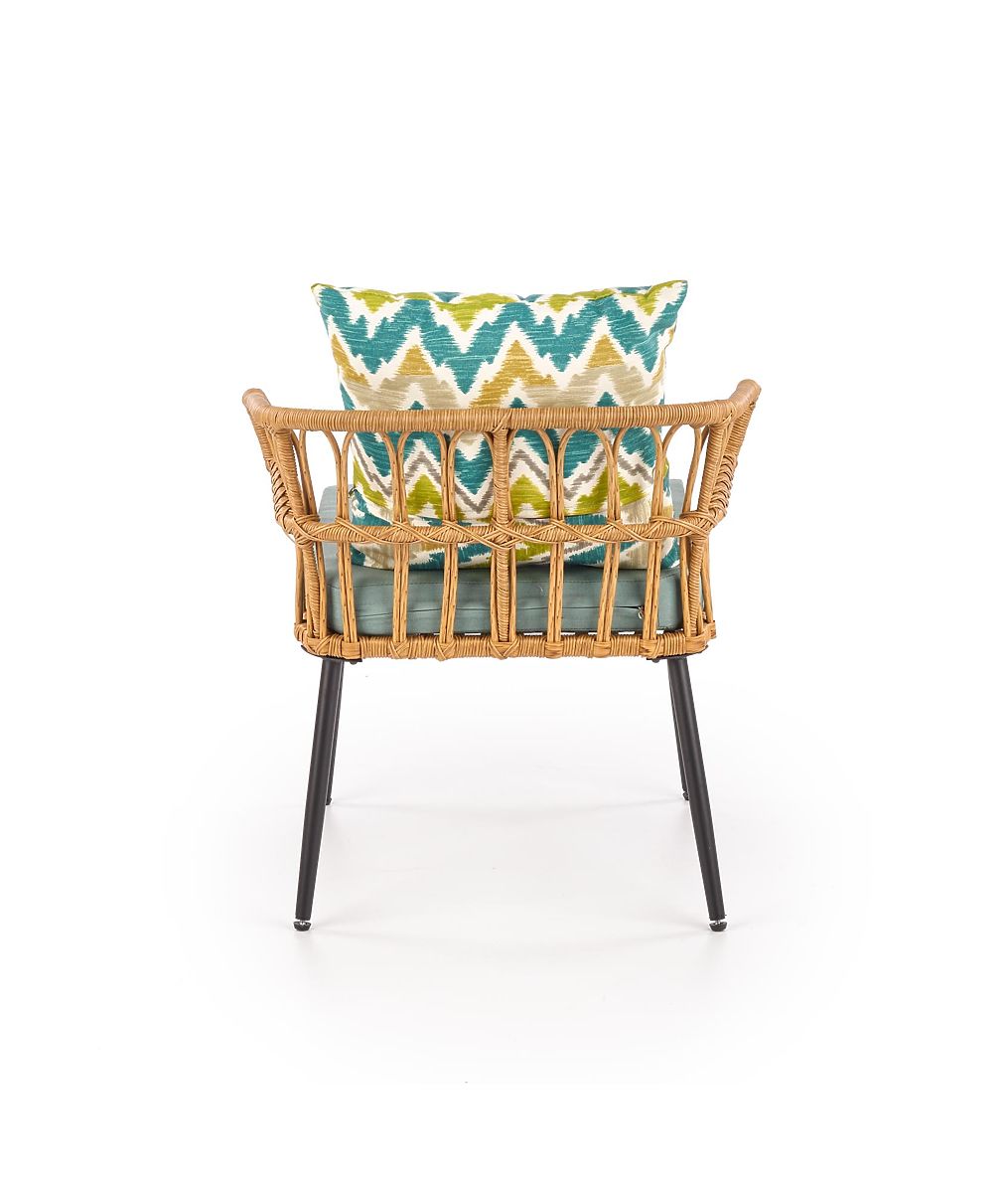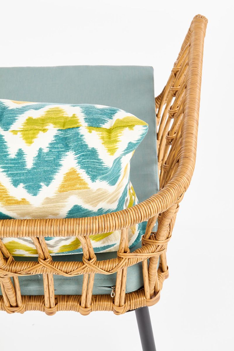 Stabilna konstrukcja wykonana jest z malowanej proszkowo stali w kolorze czarnym, która jest opleciona syntetycznym rattanem. Dla Twojej wygody w zestawie znajduje się miękka poduszka na siedzisko oraz kolorowa poduszka dekoracyjna.