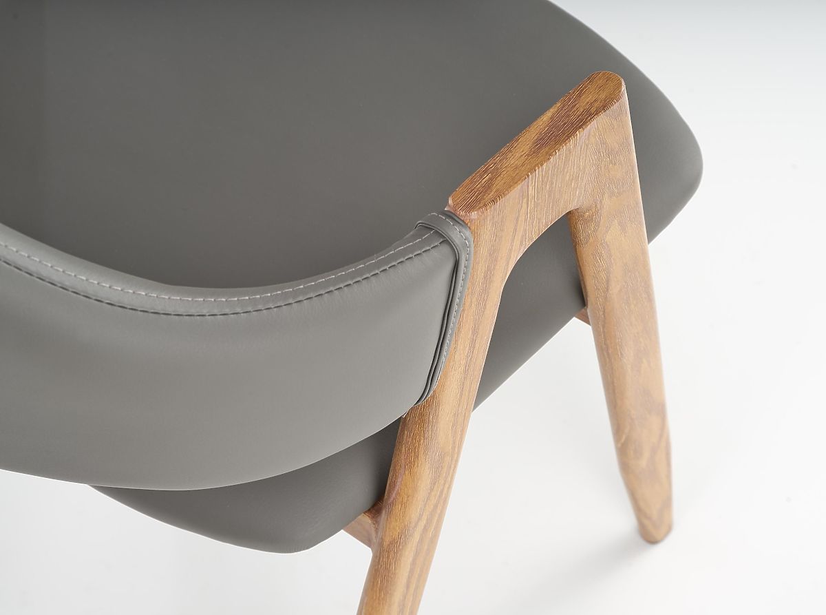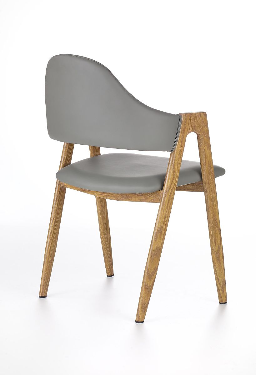 Krzesło jest tapicerowane białą ekoskórą w szarym kolorze. Konstrukcja wykonana jest z lakierowanej stali w kolorze miodowego dębu.