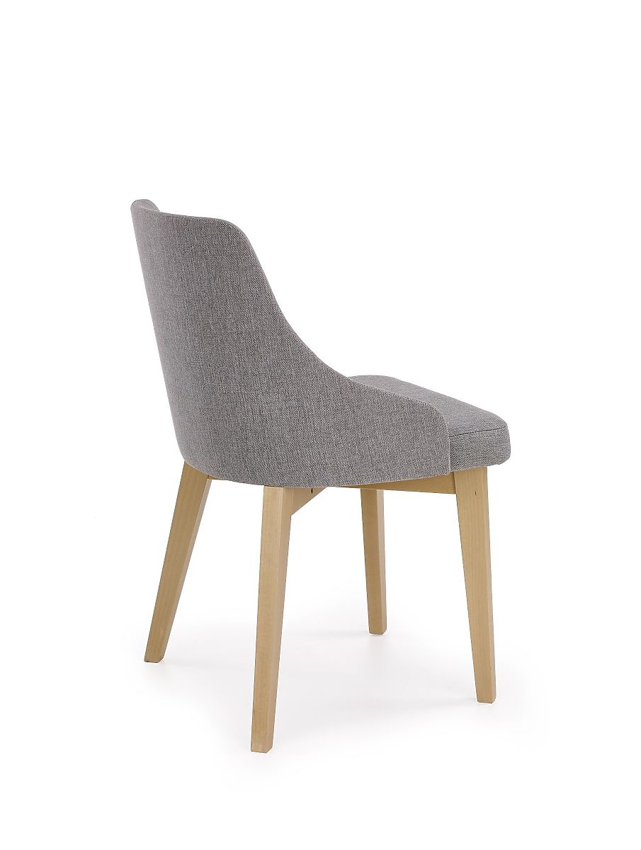 Konstrukcja krzesła wykonana jest z litego drewna bukowego w odcieniu dąb sonoma. Siedzisko i oparcie są tapicerowane przyjemną tkaniną w jasnoszarym kolorze.
