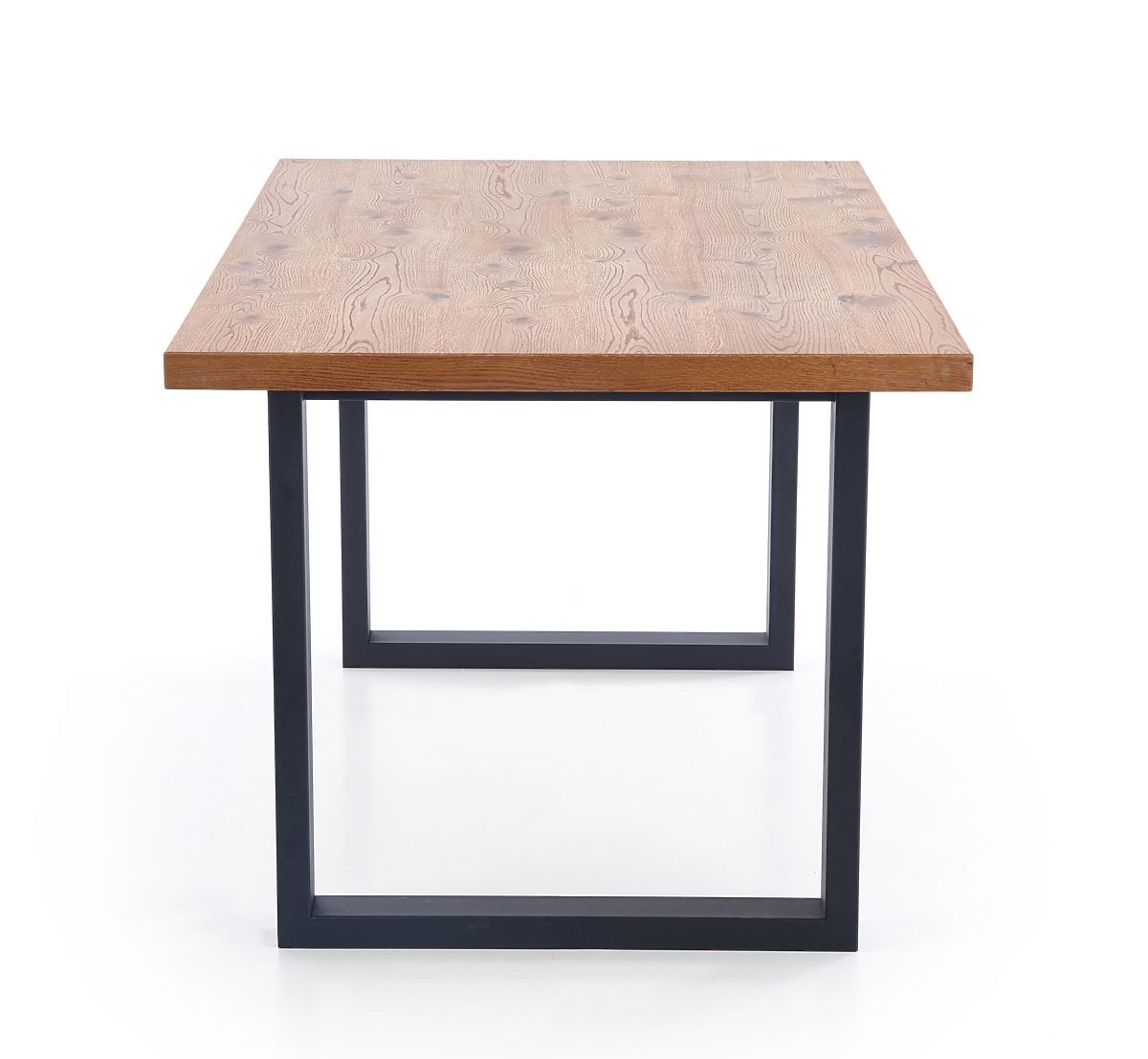 Blat stołu wykonany jest z solidnej laminowanej i fornirowanej płyty MDF, a krawędzie z litego drewna w kolorze jasnego dębu.