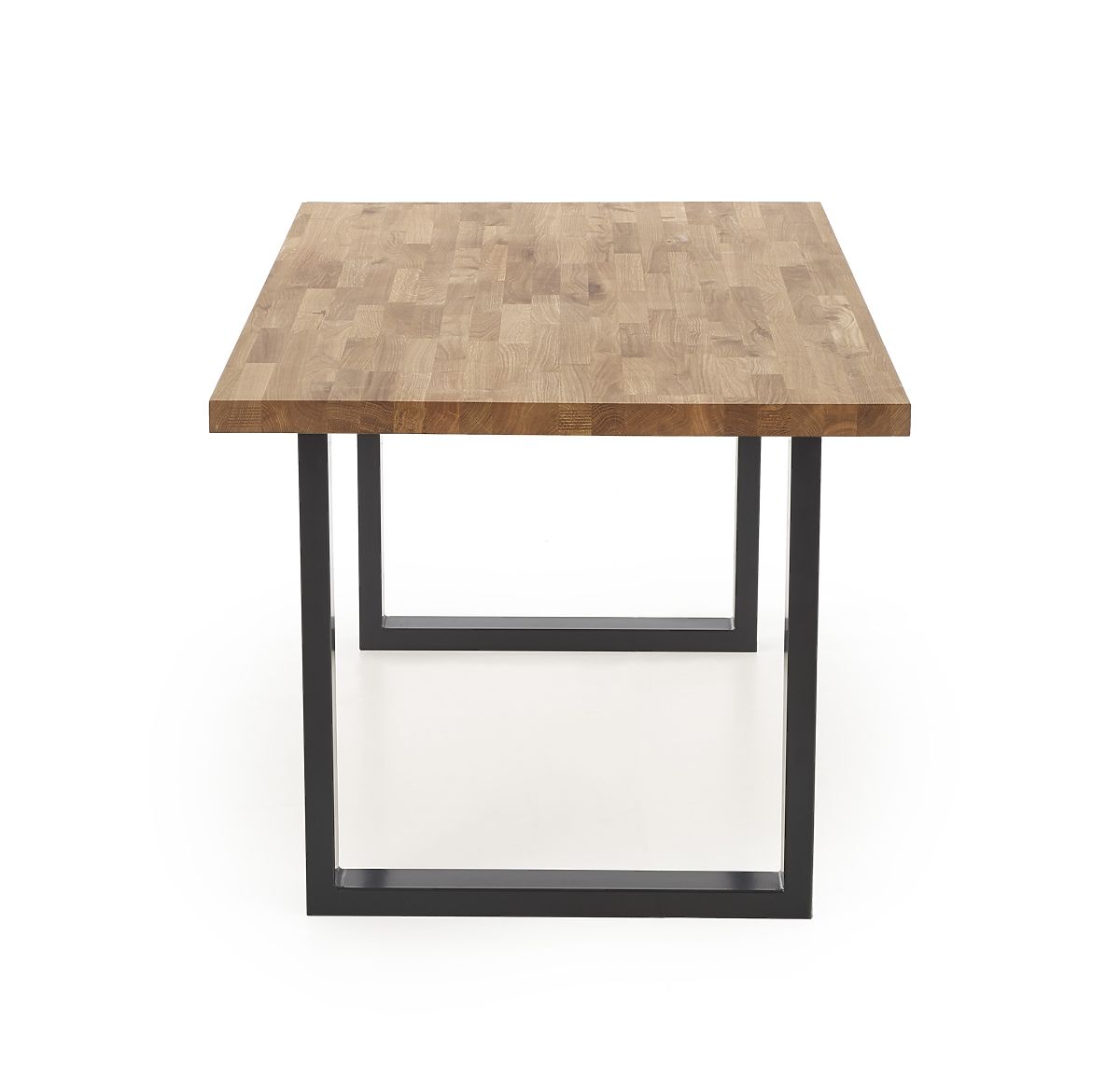 Blat stołu wykonany jest z litego drewna dębowego. Nogi stołu są z czarnej stali malowanej proszkowo.