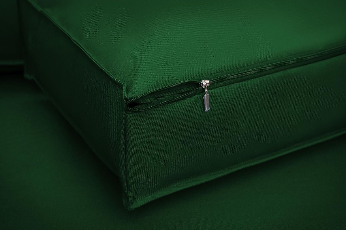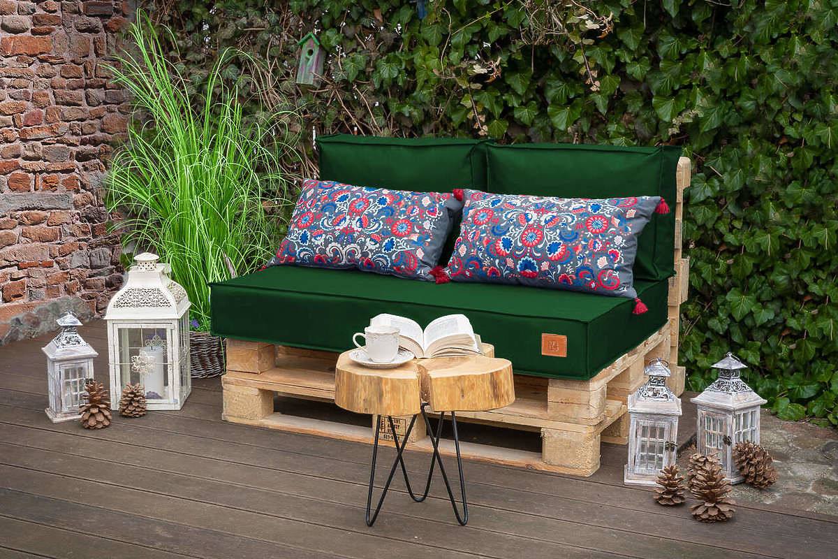 Zielony komplet poduszek na meble z palet to świetny wybór, aby w łatwy sposób urozmaicić miejsce do siedzenia na tarasie, balkonie czy w ogrodzie. Idealnie przygotowany do wymiarów europalet. Specjalna technologia szycia zapewnia odporność materiału na promieniowanie UV i wodę, dzięki czemu materiał pozostaje wytrzymały i nie blaknie.