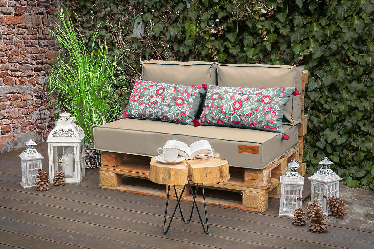 Beżowy komplet poduszek na meble z palet to doskonały wybór, aby w łatwy sposób urozmaicić miejsce do siedzenia na tarasie, balkonie czy w ogrodzie. Idealnie przygotowany do wymiarów europalet. Specjalna technologia szycia zapewnia odporność materiału na promieniowanie UV i wodę, dzięki czemu materiał pozostaje wytrzymały i nie blaknie.