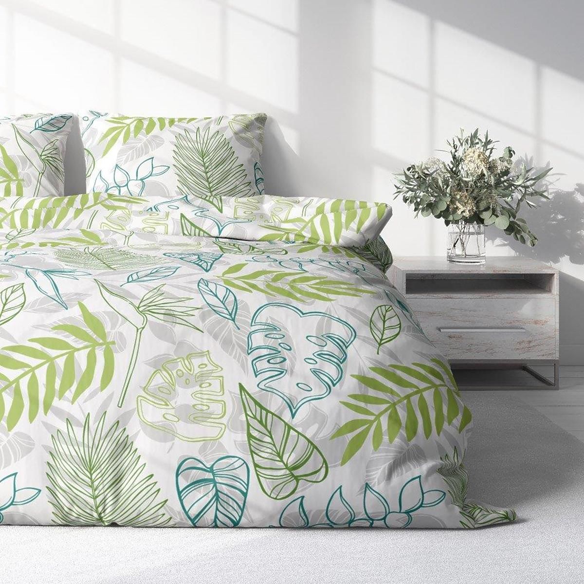 Świeży powiew natury wniesie do Twojej sypialni ta piękna pościel z motywem dużych liści roślin. Dzięki miękkiej mikrofibrze , z której wykonana jest pościel, sen będzie komfortowy i przyjemny jak nigdy dotąd. Kolory pościeli zachowują nasycenie i intensywność nawet po kilku praniach. Praktyczny zamek błyskawiczny z pewnością ułatwi przykrycie poduszek i kołder.
