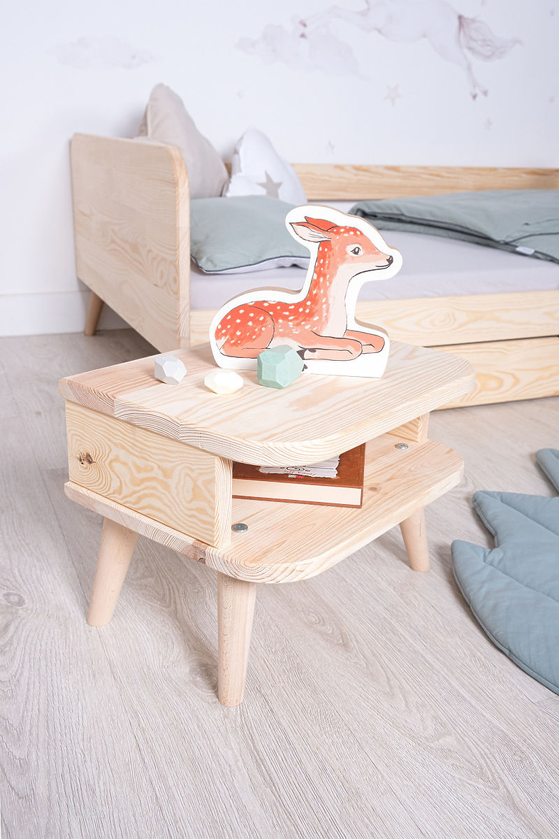Elegancki stolik nocny z kolekcji Ourbaby NELL wykonany z wysokiej jakości drewna sosnowego będzie idealnym dodatkiem do pokoju dziecięcego. Ten stolik nocny oferuje więcej niż tylko miejsce do przechowywania. Dzięki praktycznej półce zapewnia wystarczająco dużo miejsca na książki, zegarki, telefony komórkowe i inne przedmioty osobiste.