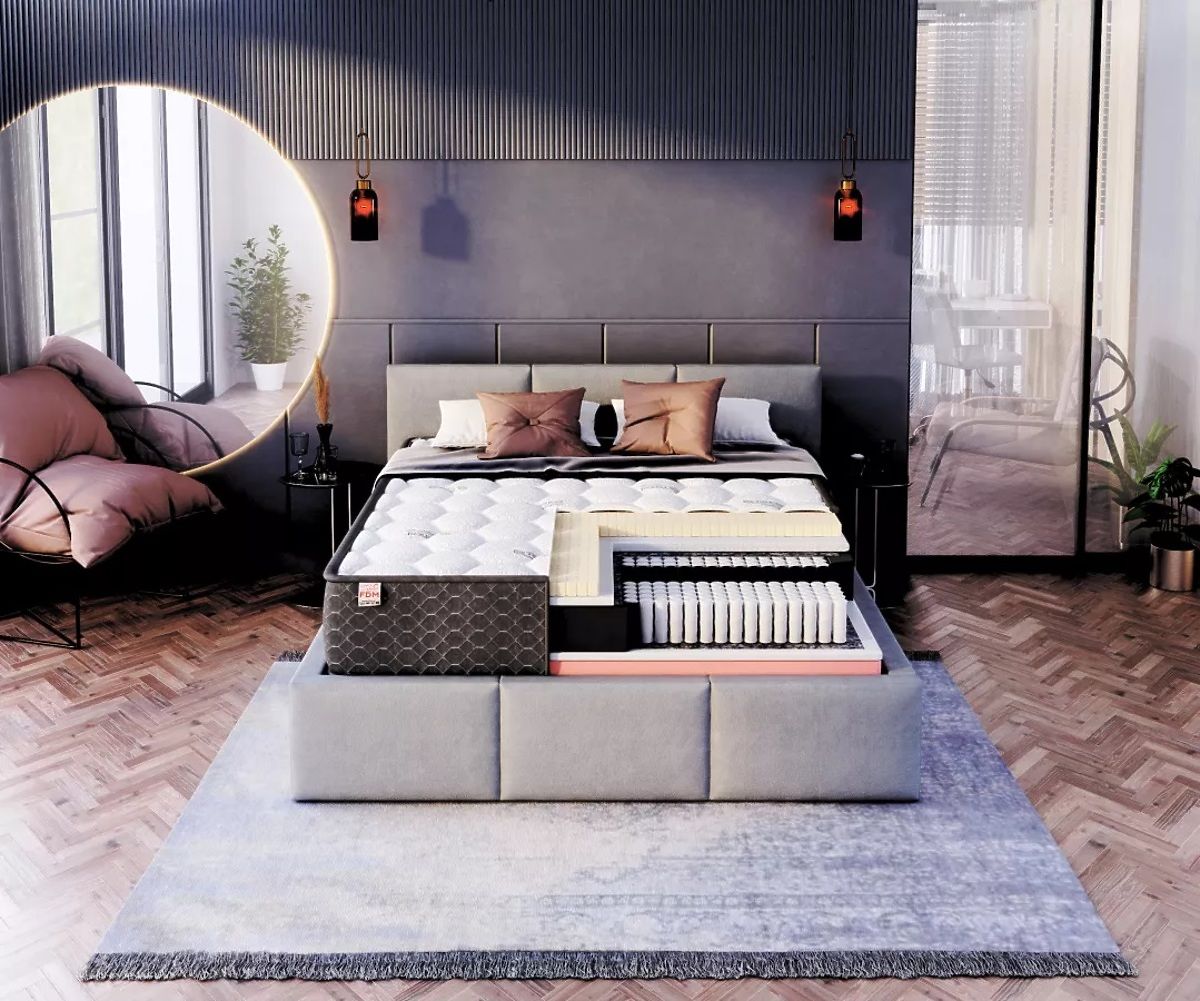 Materac COMFORT o wysokości 25 cm to wygodny model z wieloma warstwami, z których każda poprawia jakość snu. Podstawą materaca jest wkład wielokieszeniowy, który ma zwiększoną liczbę kieszeni ze sprężynami. Sprężyn wielokieszeniowych jest znacznie więcej niż standardowych kieszeniowych. Sprężyny dzielą materac na 7 stref, z których każda oferuje odpowiednie wsparcie dla danej części ciała. Dzięki temu rozwiązaniu poszczególne sprężyny indywidualnie się zginają i dostosowują do kształtu ciała leżącej osoby. Materac jest również polecany dla par, ponieważ zmniejsza dyskomfort wynikający z ruchów drugiej osoby, zapewniając nieprzerwany głęboki sen.