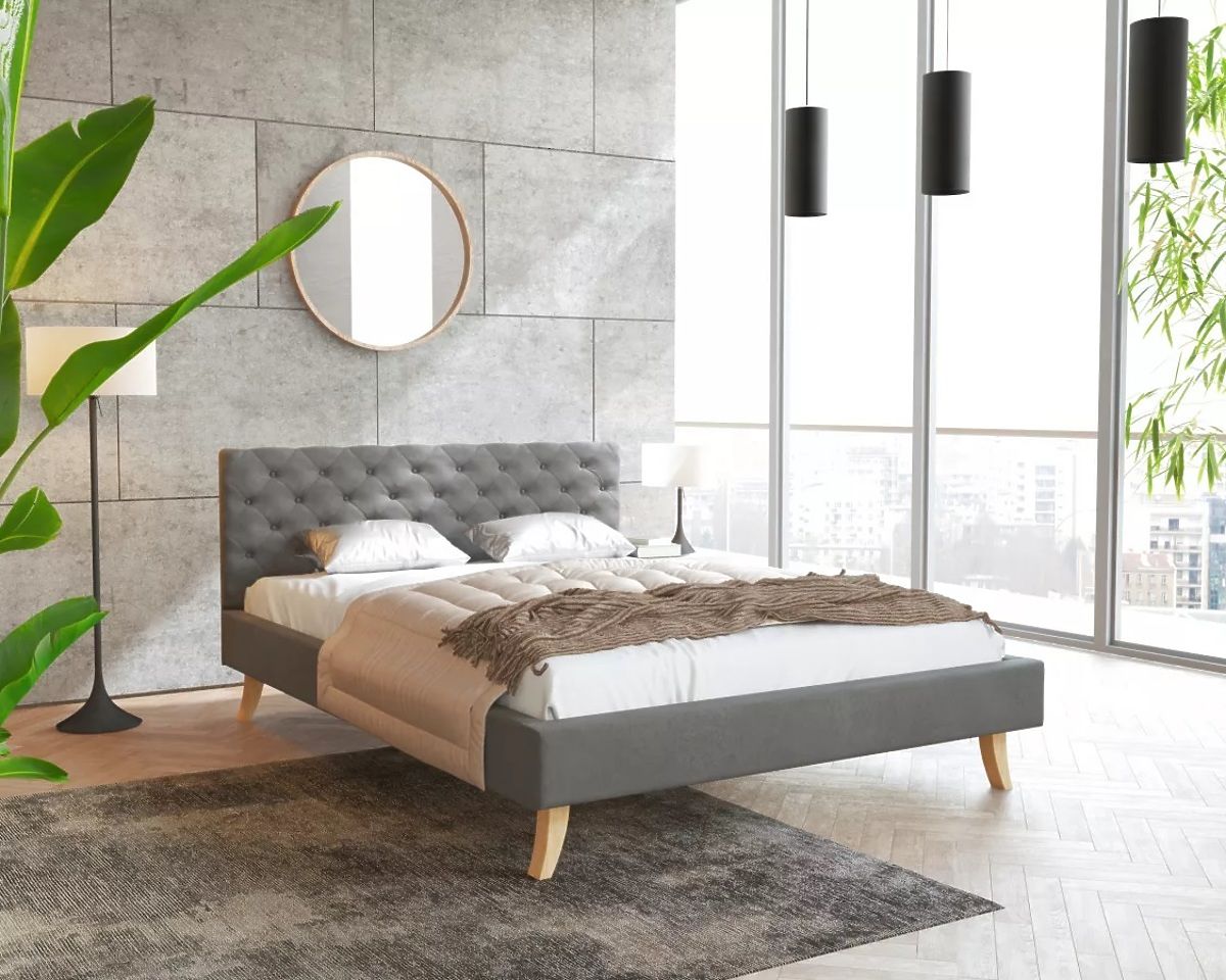Materiał obiciowy tapicerowanego łóżka to ciemnoszara tkanina welurowa Trinity. Charakteryzuje się delikatną strukturą, a jednocześnie wysoką odpornością na promieniowanie słoneczne. Jest miękka, puszysta i przyjemna w dotyku. Jest również bardzo odporna na ścieranie i mechacenie. Zachwyci Cię swoim nowoczesnym wyglądem i ozdobnym przeszyciem wezgłowia.