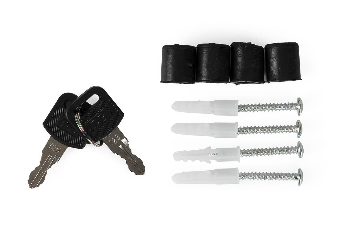 Razem ze skrzynką otrzymasz zestaw montażowy - 4 kołki i elementy dystansowe, dzięki czemu możesz zamontować skrzynkę od razu po rozpakowaniu. W zestawie znajdują się dwa klucze do otwierania skrzynki.