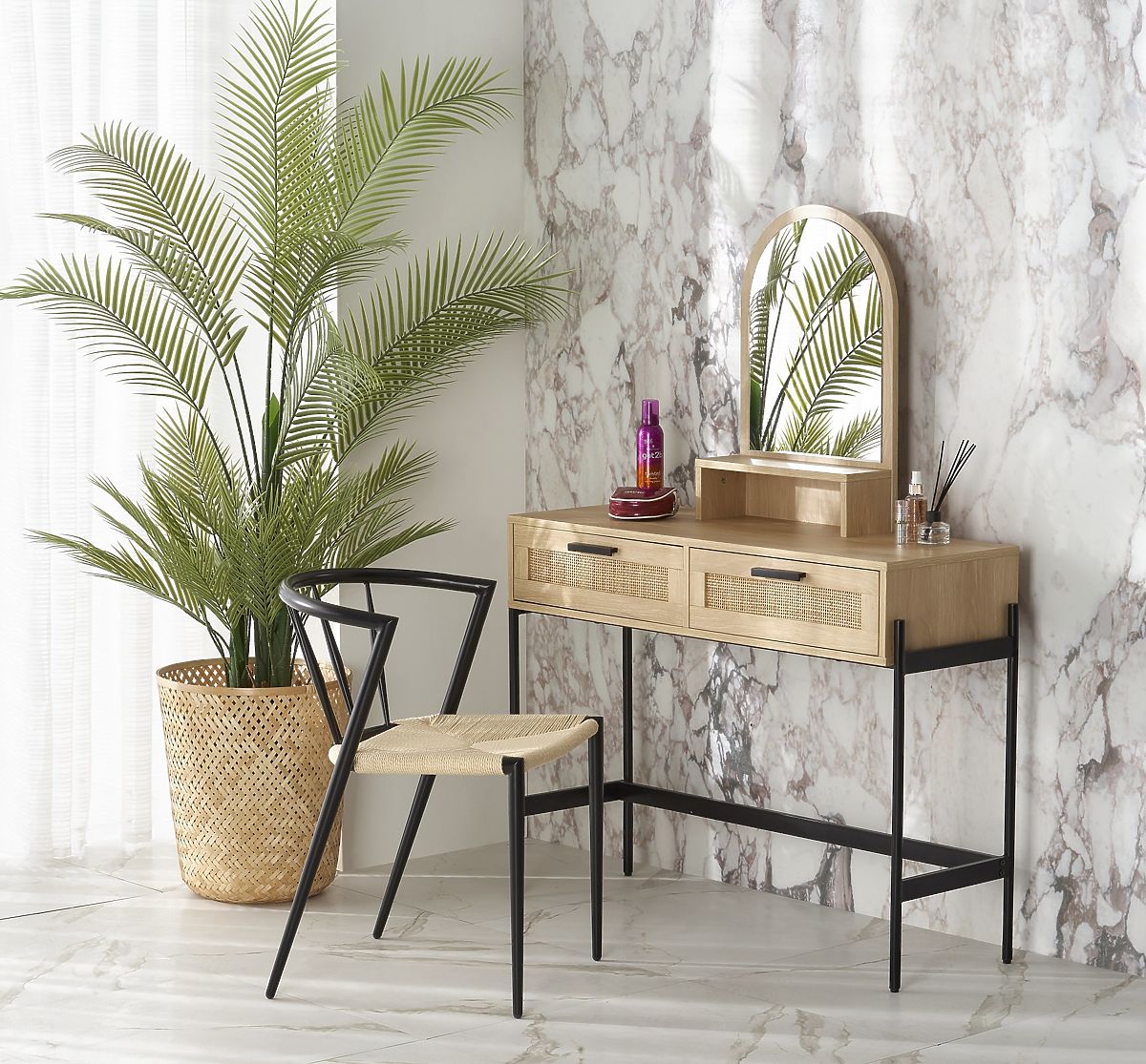 Stolik wyposażony jest w dwie zamykane szuflady oraz praktyczne lusterko, które pozwala wygodnie przeprowadzić pielęgnację i makijaż. Ten rattanowy stolik stworzy idealną przestrzeń do osobistej pielęgnacji urody.