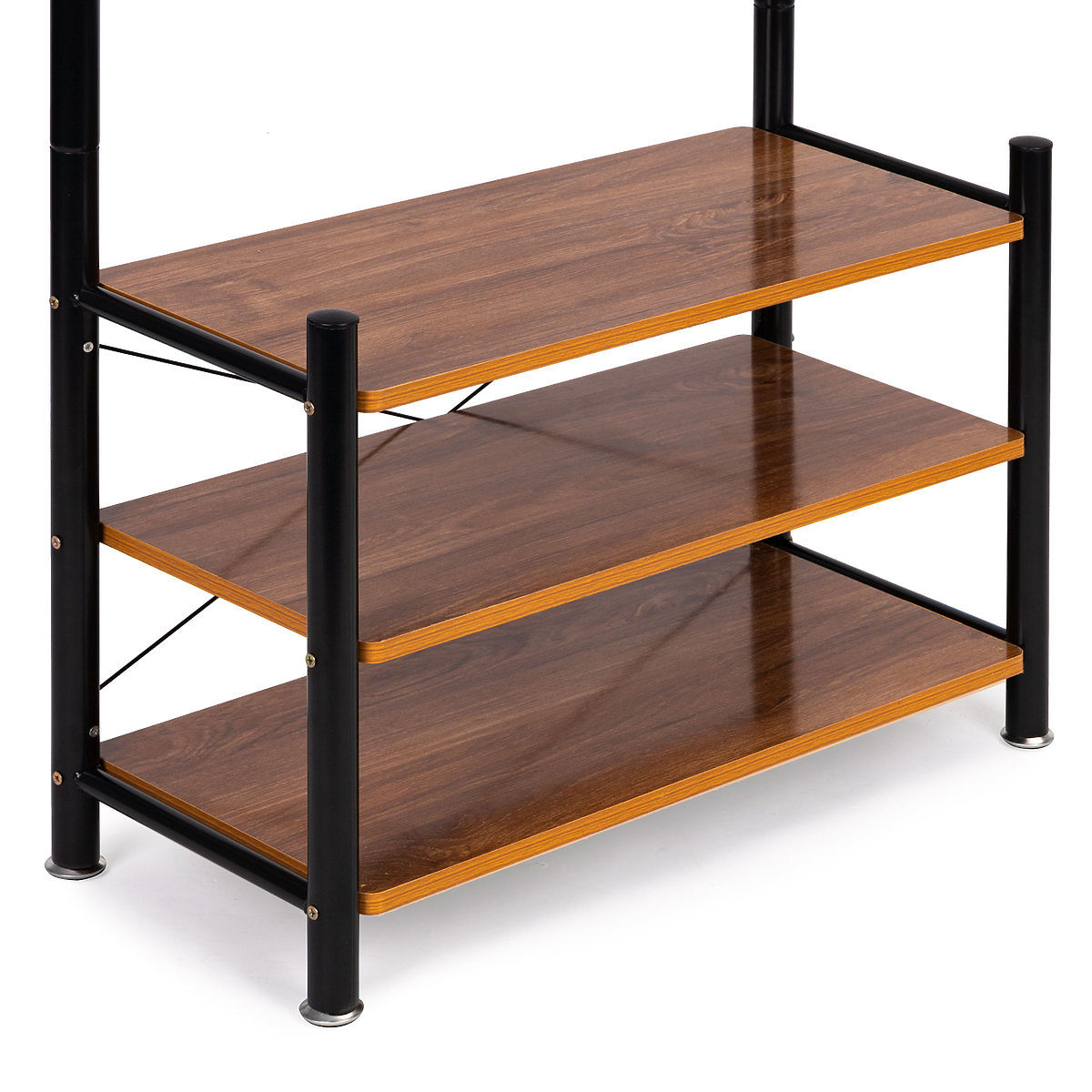 Stojak w dolnej części ma trzy funkcjonalne półki, na które można odłożyć mniejsze części ubrań, torebki, a nawet buty.