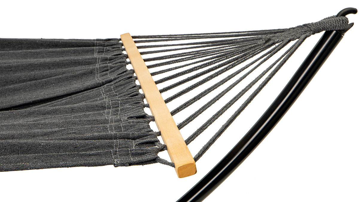 Hamak wykonany jest z trwałego materiału, który doskonale dopasowuje się do ciała. Drewniane drążki, przez które przełożone są sznury mocujące, zapewniają, że powierzchnia przeznaczona do leżenia jest odpowiednio napięta i nie skręca się.