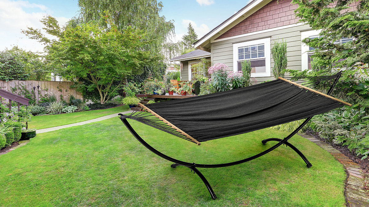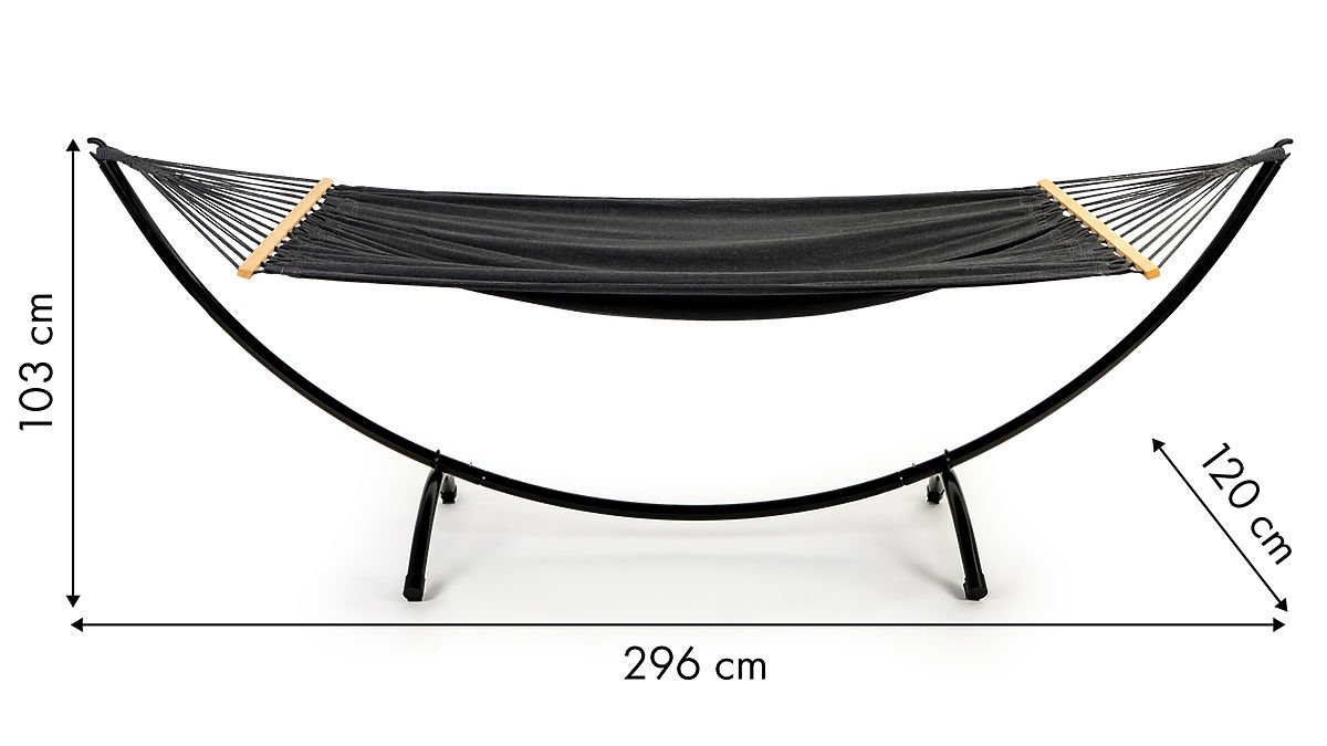 Hamak ogrodowy ze stojakiem, odporny na warunki atmosferyczne, o maksymalnym obciążeniu 150 kg. .. więcej