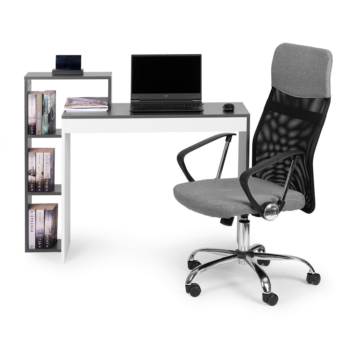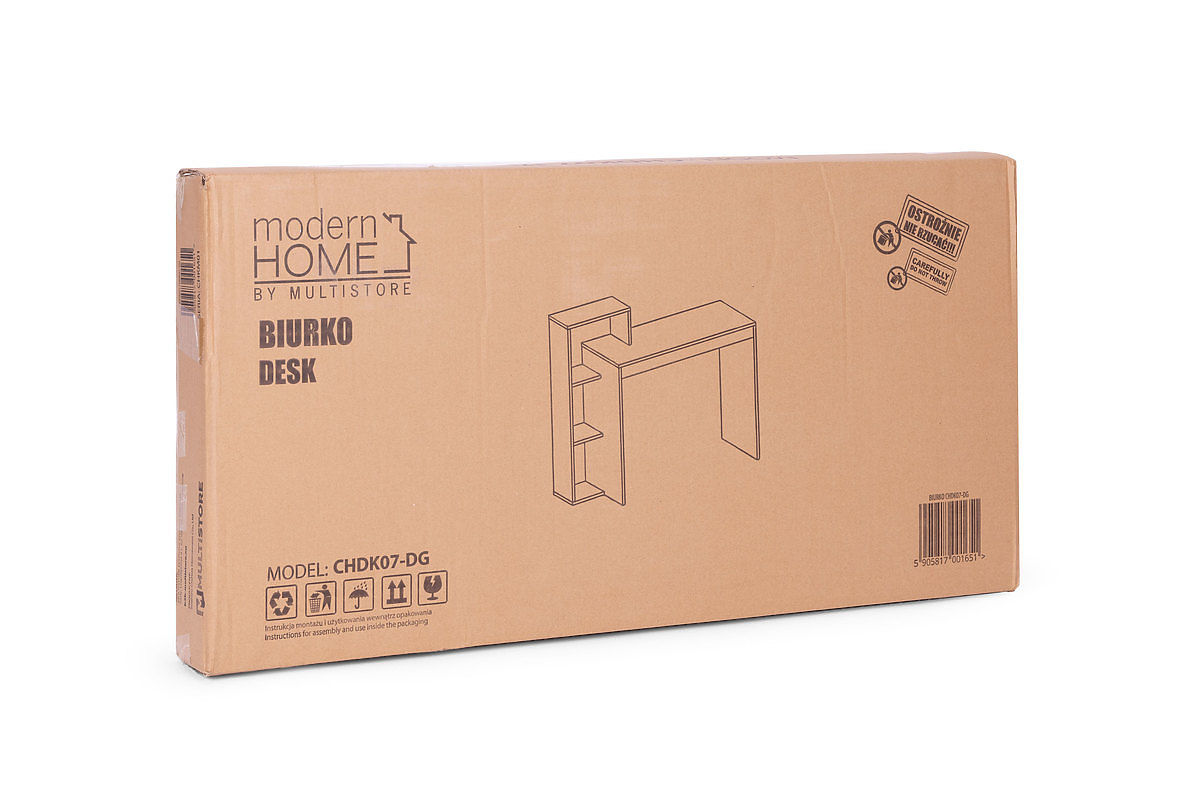 Nowoczesne biurko i prosty design to oferta dla miłośników niezwykłego stylu i funkcjonalności. Blat i półki wykonane są z płyty wiórowej pokrytej laminatem w szarym kolorze. Dzięki temu mebel delikatnie się błyszczy i wygląda bardzo luksusowo.
