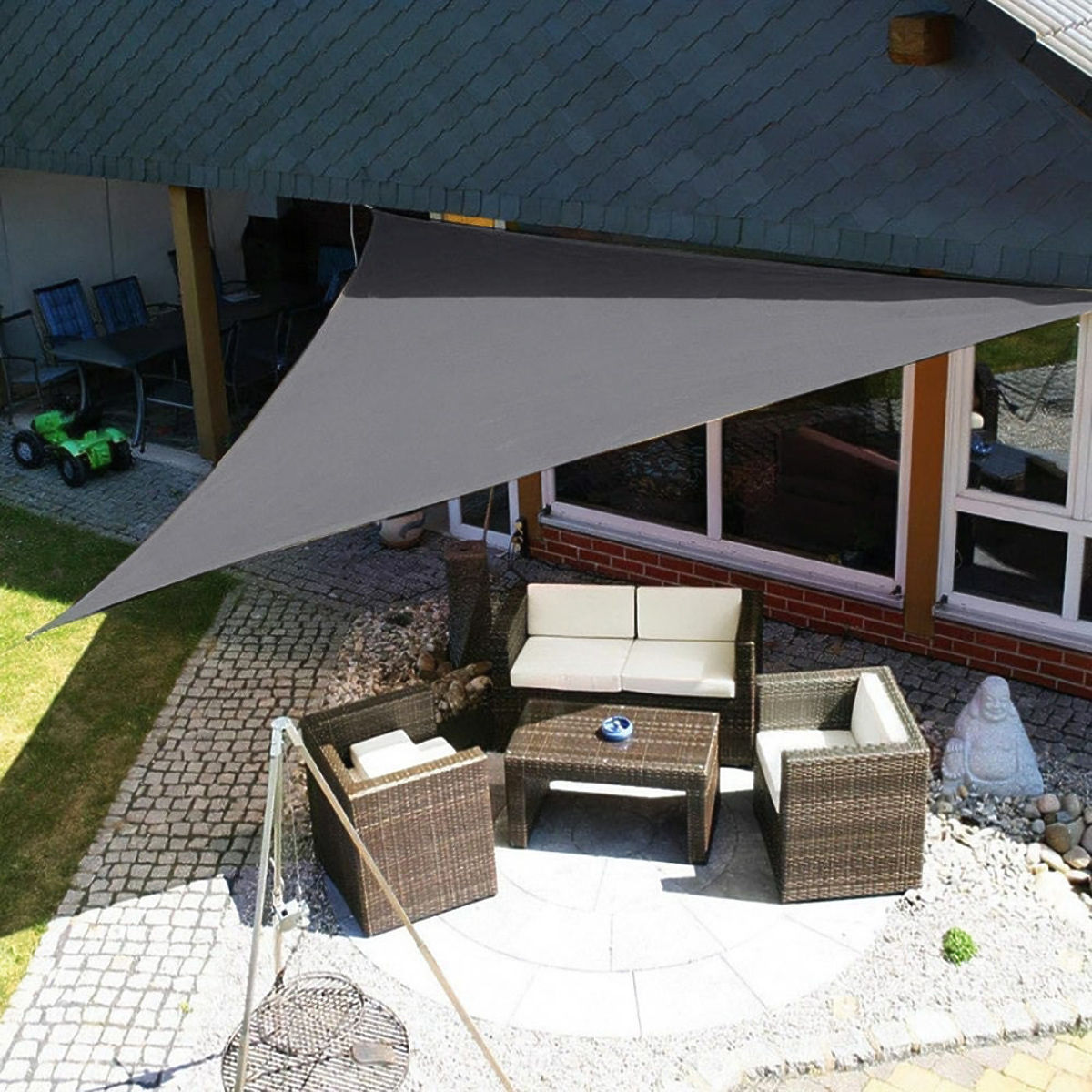 DOWOLNA KONFIGURACJAMożesz użyć kilku trójkątnych osłon i połączyć je tak, aby stworzyć duże zacienienie np. nad całą tarasem. Efekt, który osiągniesz, z pewnością ucieszy wszystkich domowników i przyciągnie uwagę każdego gościa.