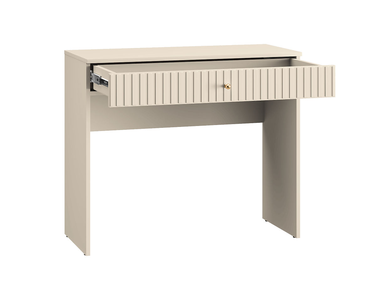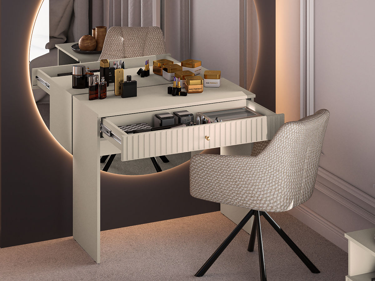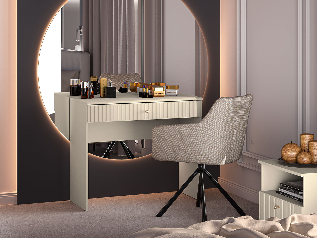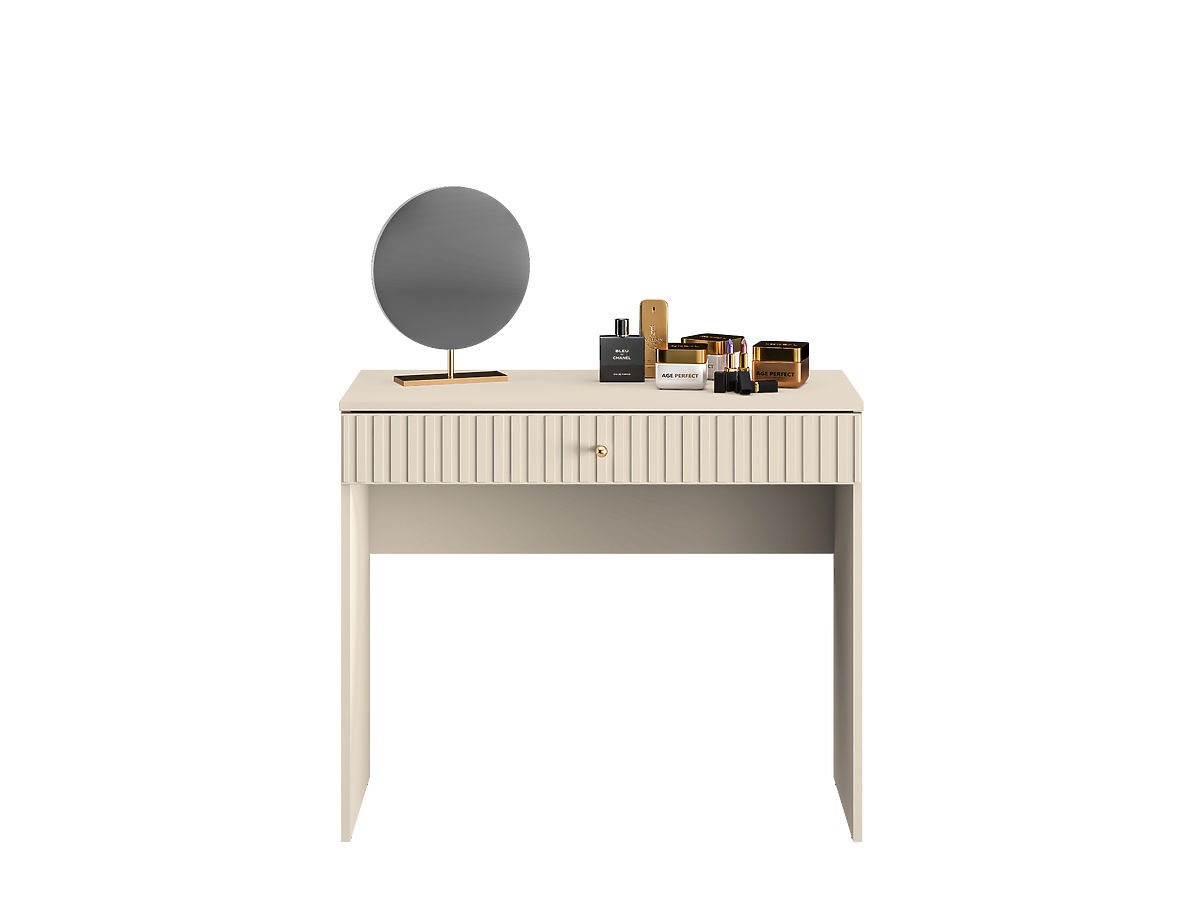 Udekoruj wnętrze według własnych upodobań dzięki eleganckiej toaletce Sophie w neutralnym i przyjemnym beżowym kolorze. Ciekawym elementem mebla jest nowoczesna frezowana szuflada oraz eleganckie uchwyty w kolorze złotym. Ten designerski element zapewnia wystarczająco dużo miejsca do przechowywania kosmetyków, biżuterii i innych niezbędnych przedmiotów do codziennej pielęgnacji. Dzięki toaletce Sophie otrzymujesz nie tylko praktyczny mebel, ale także stylowy i harmonijny dodatek do Twojej sypialni.