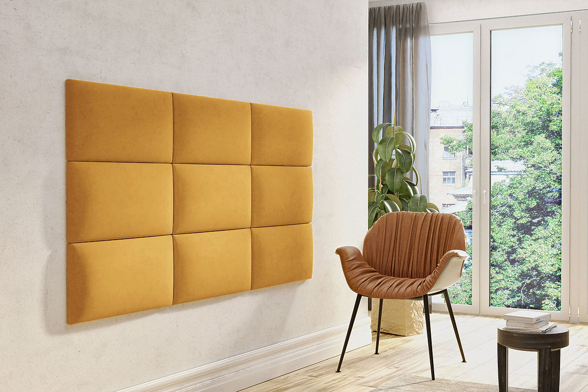 Tapicerowane panele Klasik w kolorze musztardowym są dostępne w trzech różnych rozmiarach: