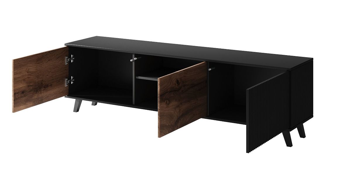 Materiał: Stolik RTV jest wykonany z fornirowanej płyty MDF oraz fornirowanej płyty meblowej, co gwarantuje jego trwałość i długą żywotność. MDF jest znana ze swojej stabilności i gładkiej powierzchni, idealnej do wysokiej jakości wykończeń. Nogi stołu są wykonane z polipropylenu, co zapewnia wytrzymałość i stabilność.