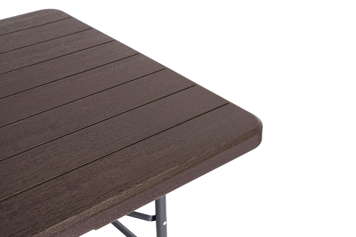 Blat stołu wykonany jest z trwałego materiału HDPE, który jest odporny na wszelkie warunki atmosferyczne na zewnątrz. Wygląd blatu przypomina teksturę drewna, co pełni dodatkową rolę dekoracyjną. Blat jest bardzo łatwy w utrzymaniu i nie plami się.