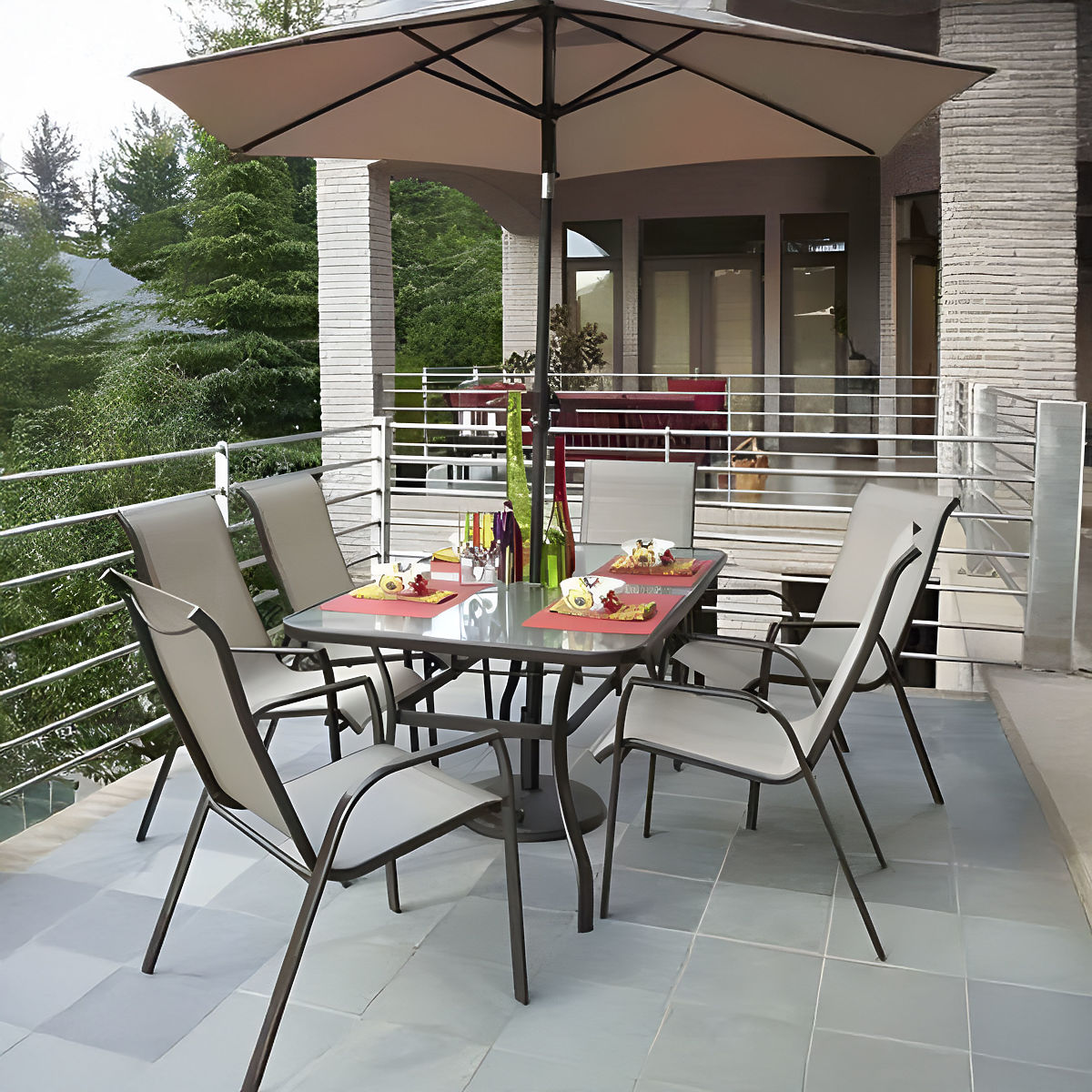 Stół ogrodowy z hartowanym szkłem i otworem na parasol. .. więcej
