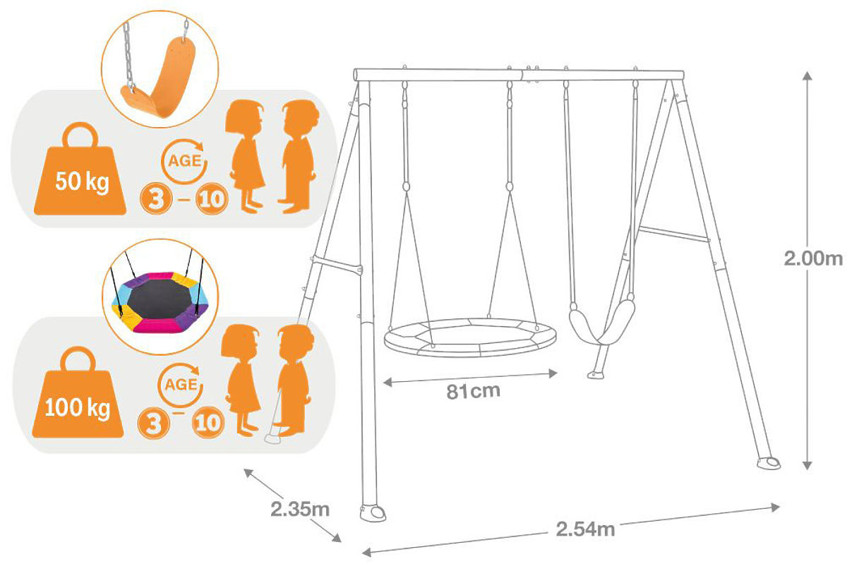 BEZPIECZEŃSTWO I JAKOŚĆSolidna konstrukcja z metalowych rur o średnicy 0,60 mm i grubości 0,09 mm zapewnia niezawodną stabilność i długą żywotność – nawet przy codziennym, intensywnym użytkowaniu w ogrodzie. Dodatkowe kołki kotwiące skutecznie zabezpieczają całość przed przesunięciem, gwarantując maksymalne bezpieczeństwo podczas zabawy. To rozwiązanie, które przynosi spokój rodzicom i jeszcze więcej radości dzieciom.