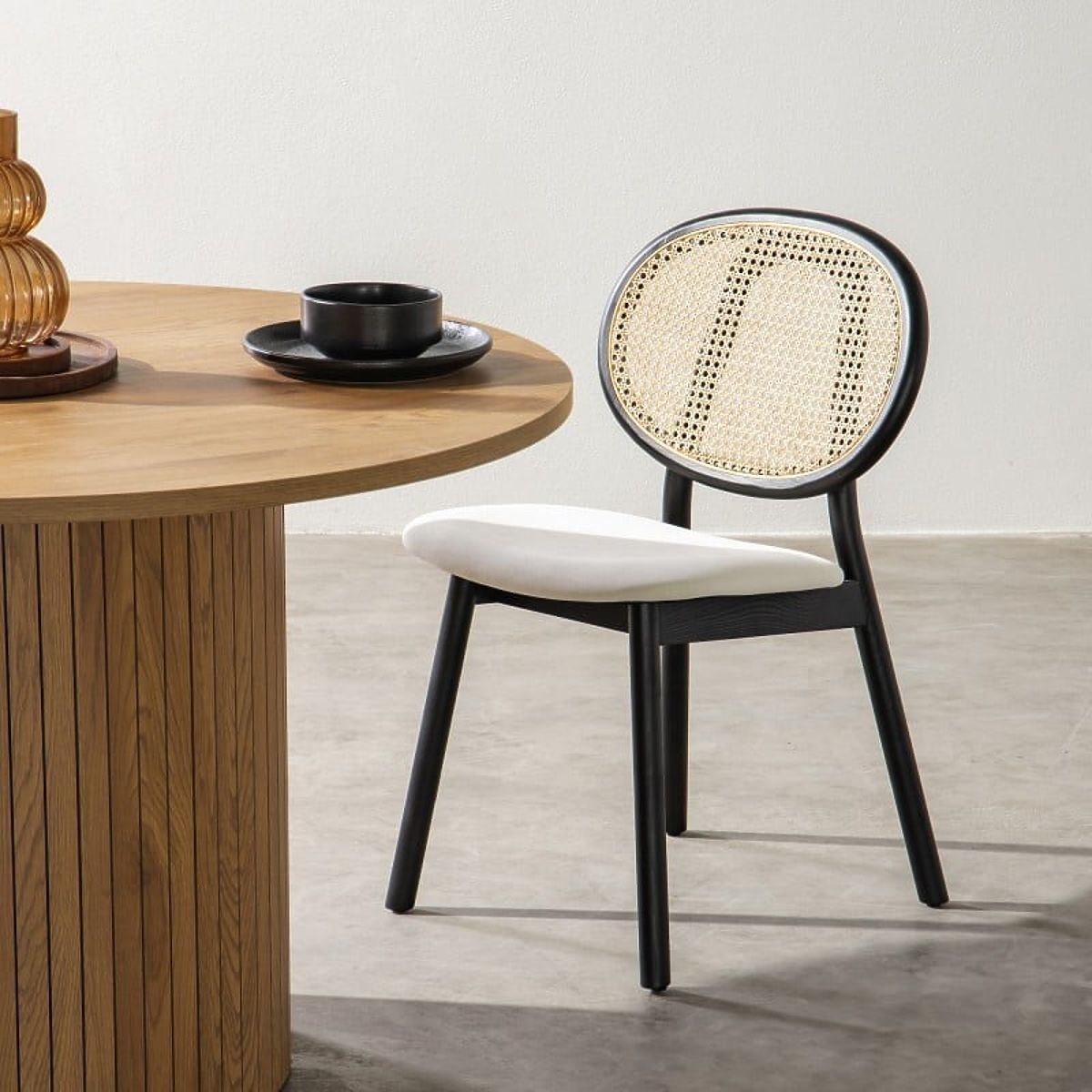 Lukahome.pl » Jadalnia i kuchnia / Krzesła do jadalni / Drewniane krzesło Monet z wiedeńskim splotem, rattan, aksamit, czarny/ecru