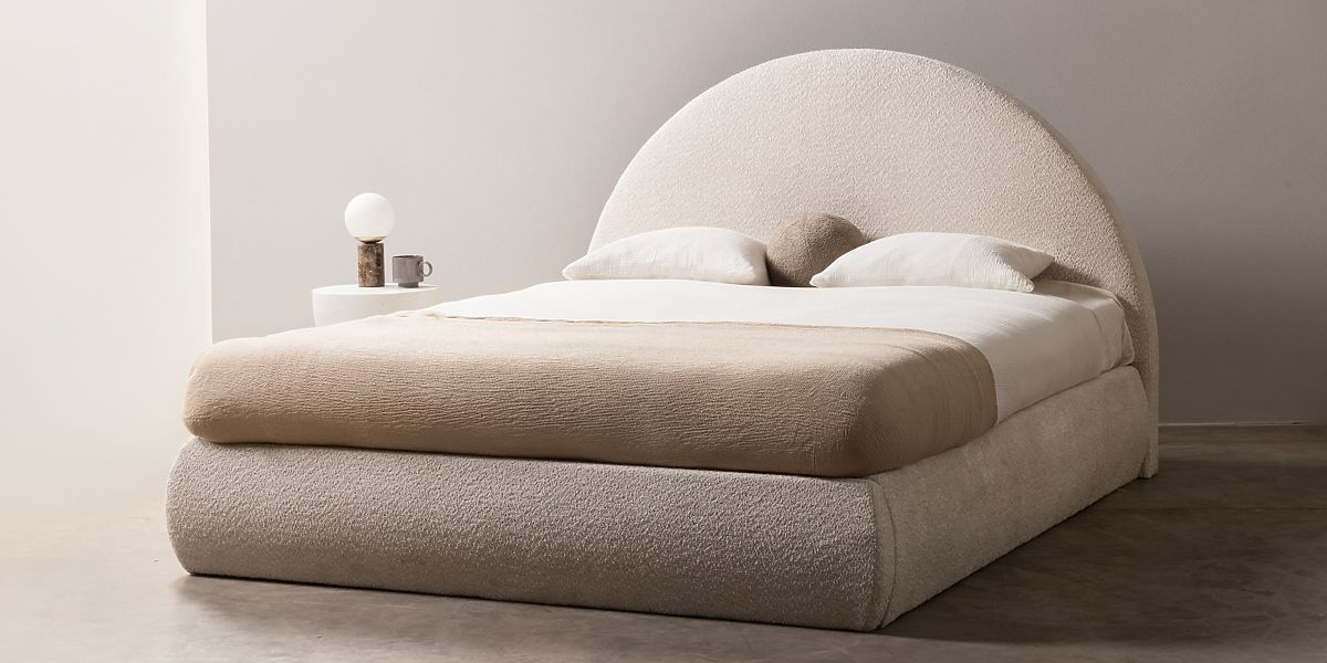 Tapicerowane łóżko Orbi z zaokrąglonym wezgłowiem i schowkiem. .. więcej