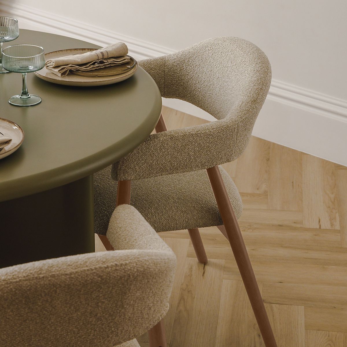 Krzesło Sorrento z beżowej tkaniny boucle z jasnymi orzechowymi nogami. .. więcej