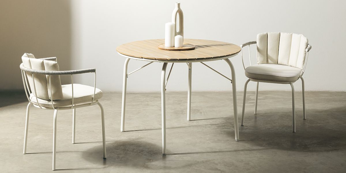 Okrągły stół ogrodowy z akacjowym blatem i białymi nogami. .. więcej