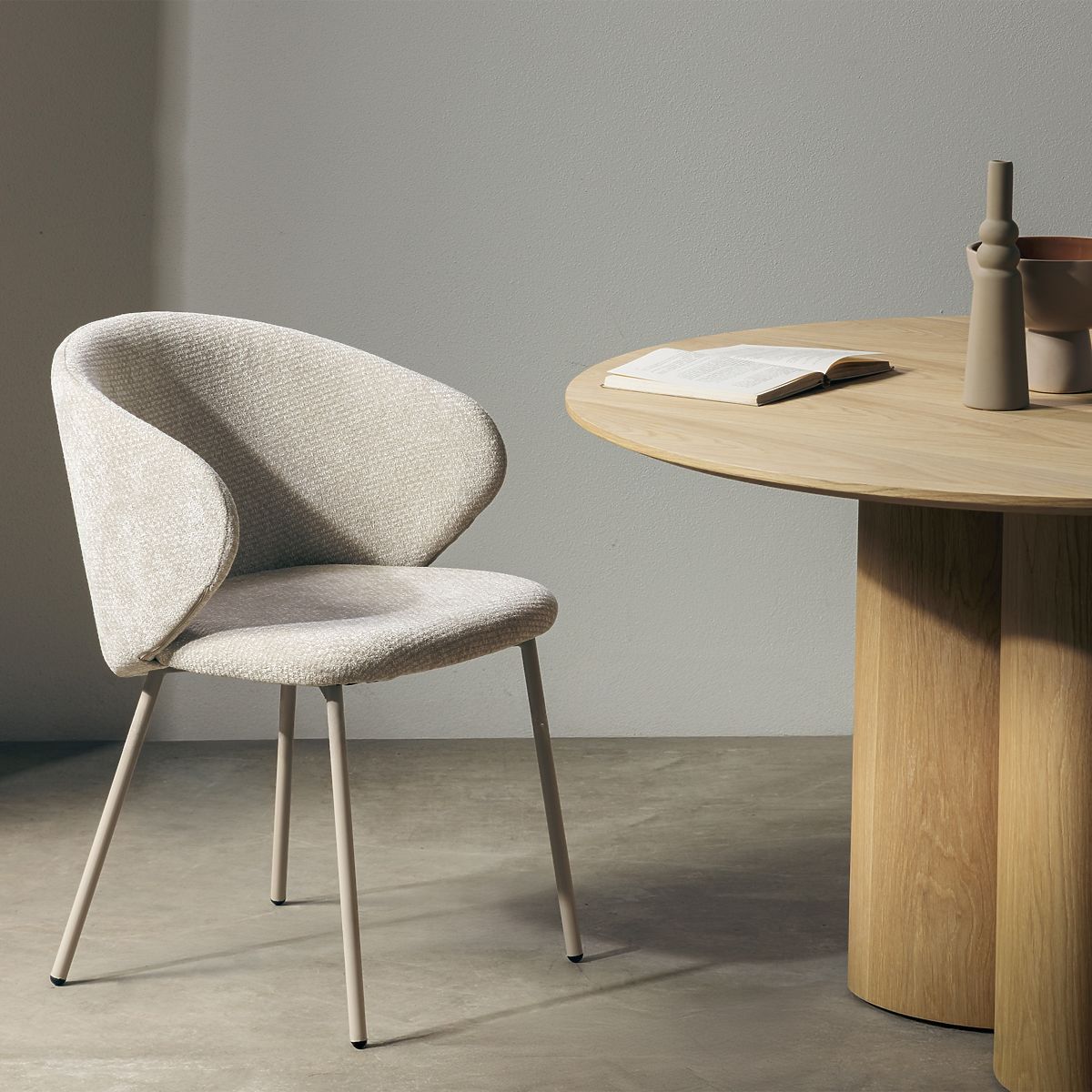 Krzesło Adrano z jasnobeżową tapicerką i beżowymi nogami. .. więcej