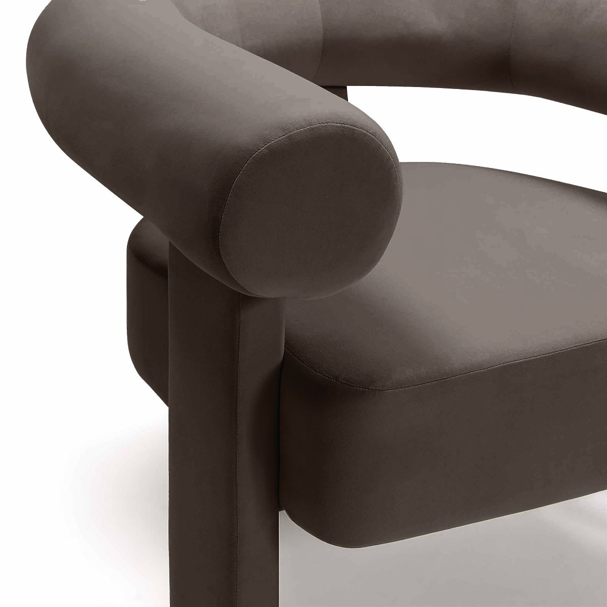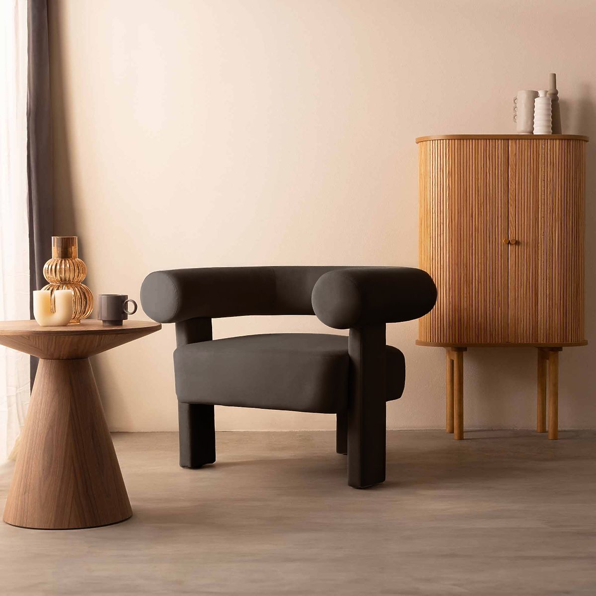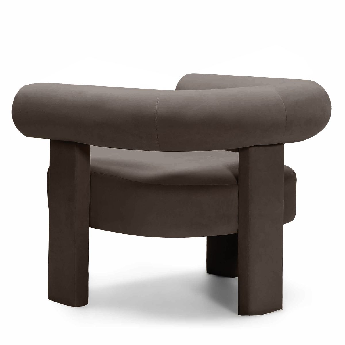 Fotel Hella z aksamitną tkaniną i zaokrąglonymi kształtami. .. więcej