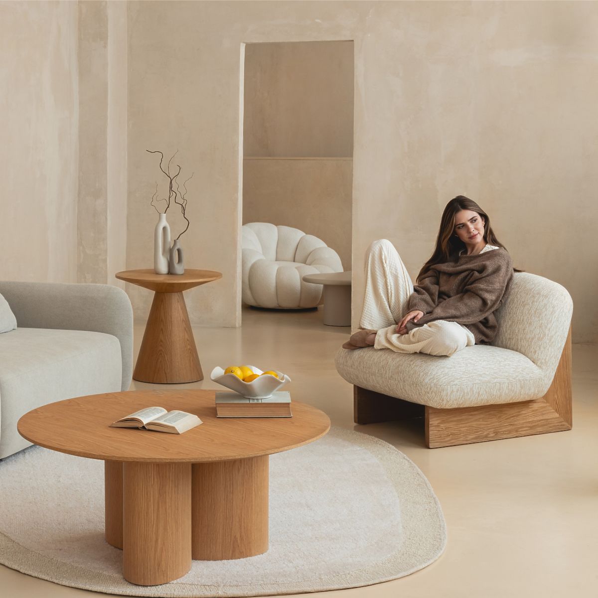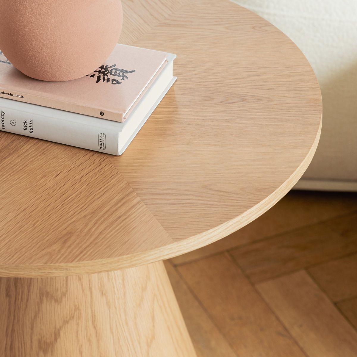 Okrągły stolik z naturalnej dębowej okleiny, idealny do każdego wnętrza. .. więcej