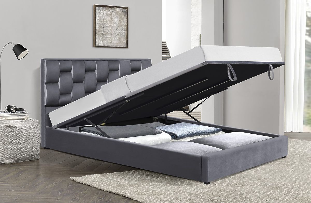 Łóżko z pojemnikiem na pościel w kolorze szarym. .. więcej
