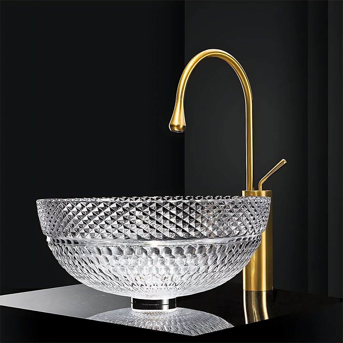 Kryształowa, ponadczasowa umywalka Sue to wyjątkowy element wyposażenia łazienki, łączący elegancję z funkcjonalnością. Wykonana z wysokiej jakości hartowanego szkła, zachwyca precyzyjnie zdobioną powierzchnią z efektownym diamentowym wzorem, który pięknie odbija światło, nadając wnętrzu luksusowy charakter. Dzięki swojej konstrukcji jest przystosowana do montażu na blacie lub szafce, co pozwala na swobodne dostosowanie do różnorodnych aranżacji. To doskonały wybór dla tych, którzy chcą dodać swojej łazience wyjątkowy styl i elegancję.