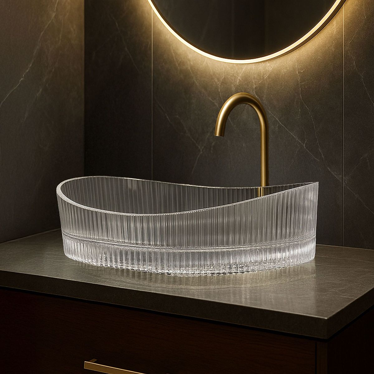 Model Harper łączy estetykę z funkcjonalnością – solidne szkło jest odporne na codzienne użytkowanie, a gładka powierzchnia wewnątrz misy ułatwia utrzymanie czystości. Jest przystosowana do montażu na blacie lub szafce, co daje pełną swobodę w aranżacji. Jej nowoczesny design doskonale komponuje się z armaturą w odcieniach złota, czerni lub chromu, co pozwala stworzyć spójną i efektowną przestrzeń.