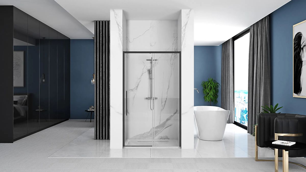 Czarne, matowe drzwi prysznicowe z łatwą do czyszczenia powierzchnią. .. więcej