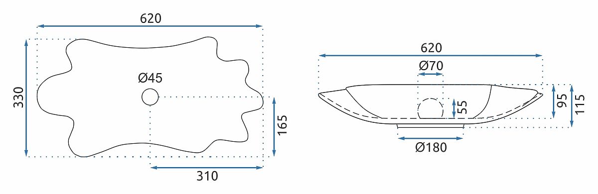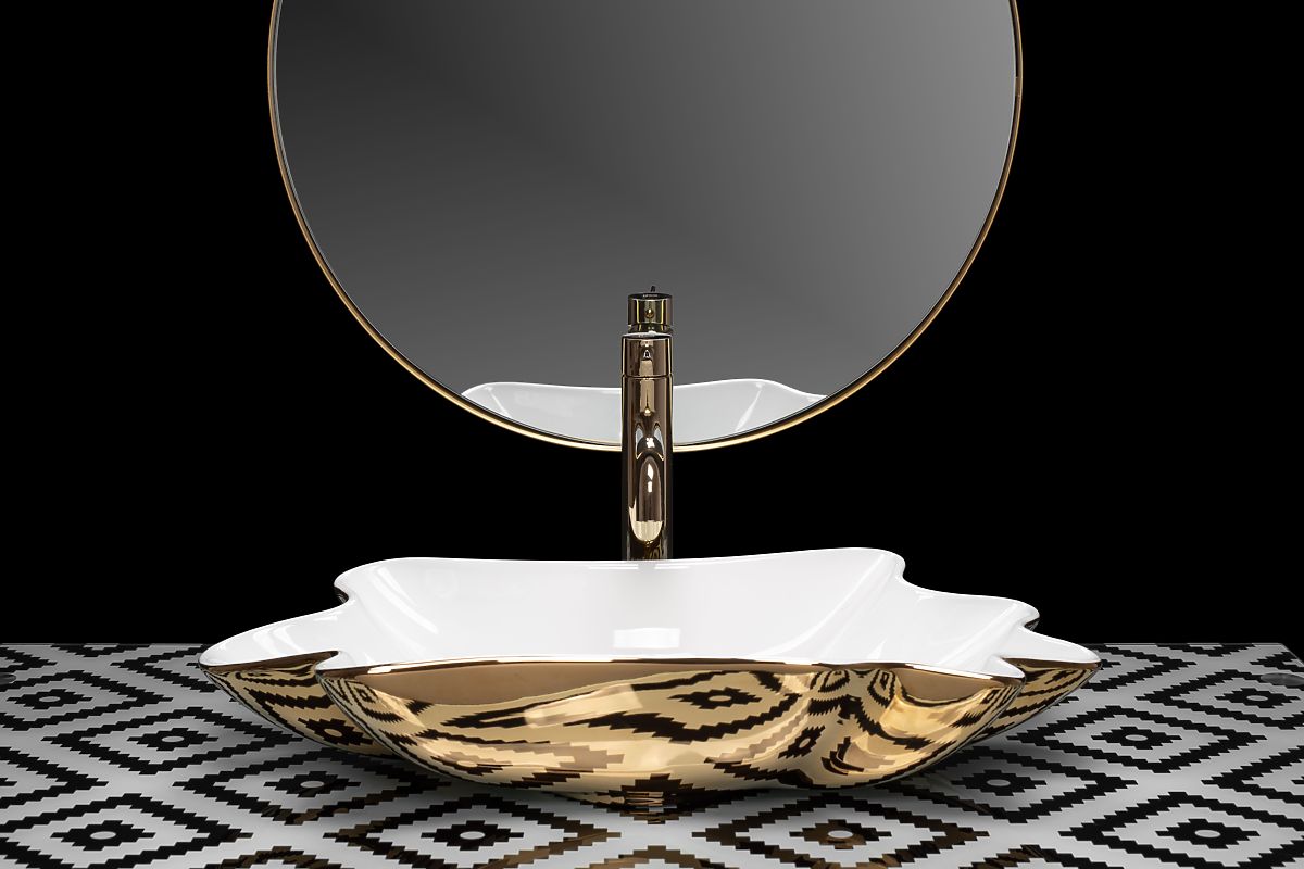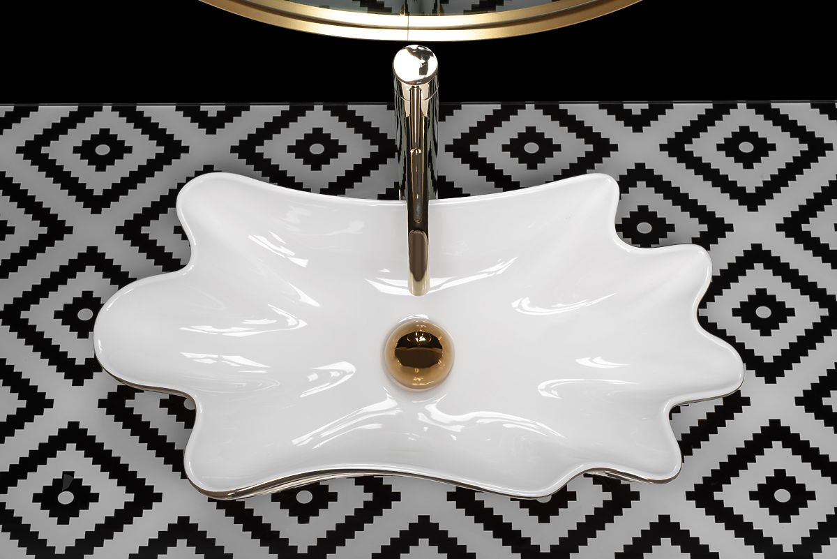 Umywalka wykonana z najwyższej jakości ceramiki w białym kolorze i owalnym, falistym kształcie. Umywalka jest wykończona złotą krawędzią, co nadaje piękny końcowy efekt. Umywalka jest niezwykle atrakcyjna wizualnie, idealna dla miłośników niestandardowych kształtów, wnosi elegancję do aranżacji łazienki zarówno w domu, jak i w biurze.