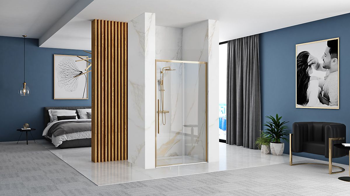 Złote drzwi prysznicowe z łatwą do utrzymania w czystości powierzchnią. .. więcej