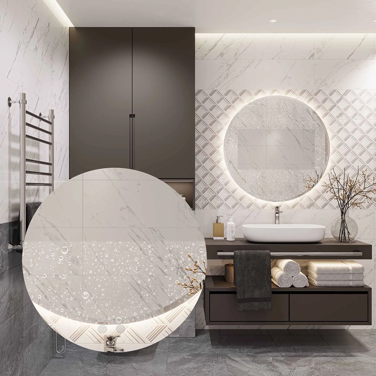 Okrągłe lustro z oświetleniem LED to idealny wybór dla tych, którzy cenią sobie wygodę użytkowania i nowoczesny design. Lustro wykonane jest z najwyższej jakości materiałów, świetnie wygląda i jest bardzo trwałe. Oferuje trzy dotykowo zmienialne kolory światła LED – ciepły, neutralny i zimny, oraz funkcję ogrzewania, która zapobiega zaparowywaniu powierzchni. Dotykowy przełącznik umieszczony na powierzchni lustra jest podświetlany na niebiesko po aktywacji funkcji. Biały kabel zasilający ma długość 110 cm.