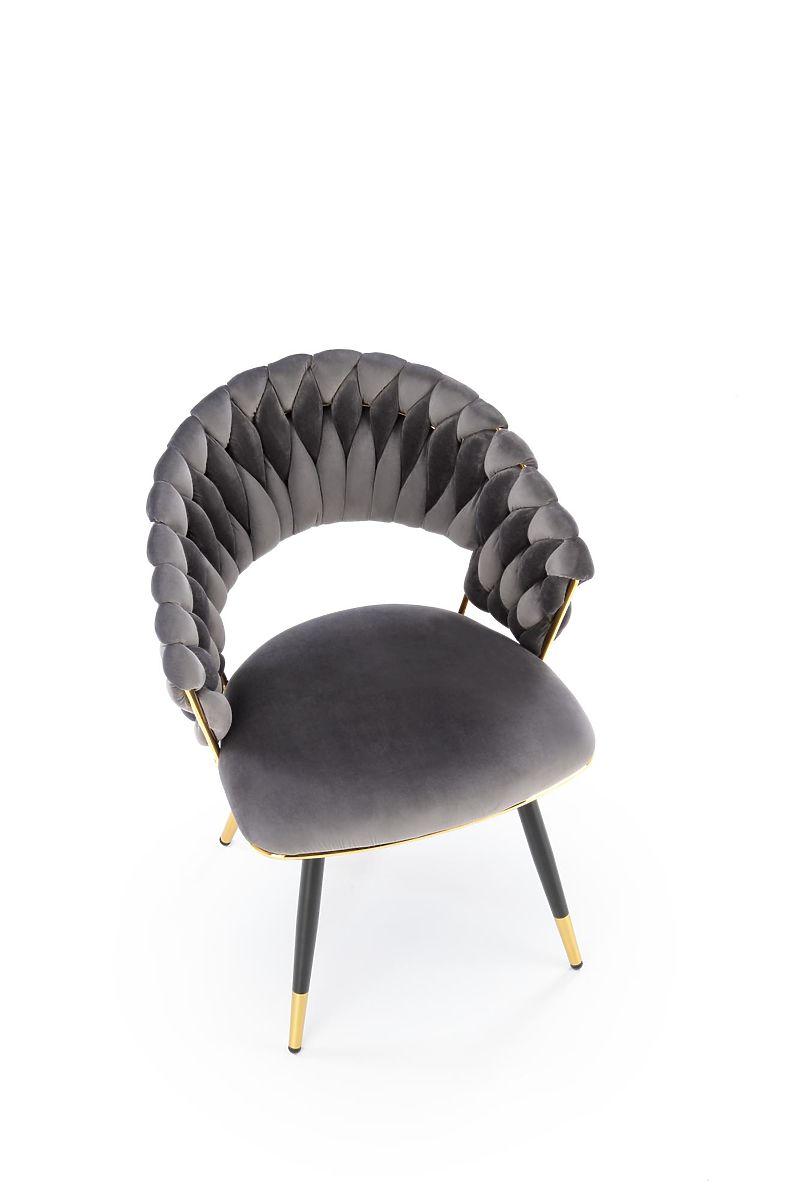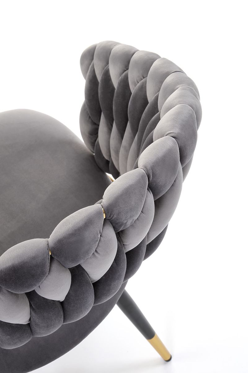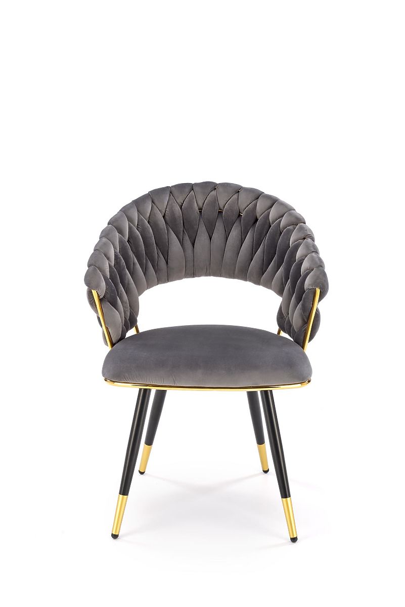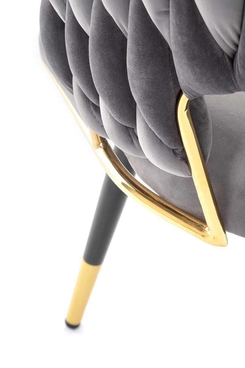 Krzesło z tkaniny aksamitnej w kolorze szarym i złotym. .. więcej