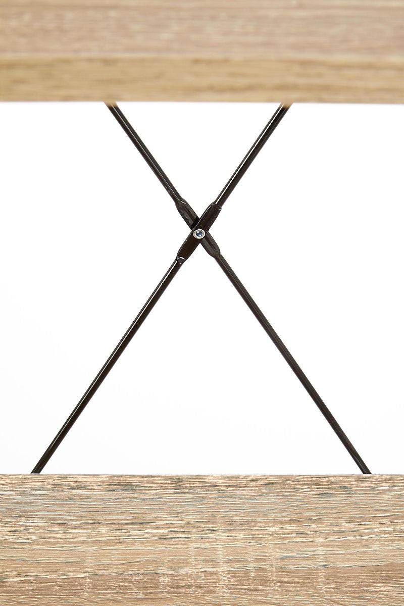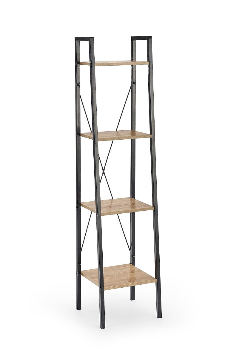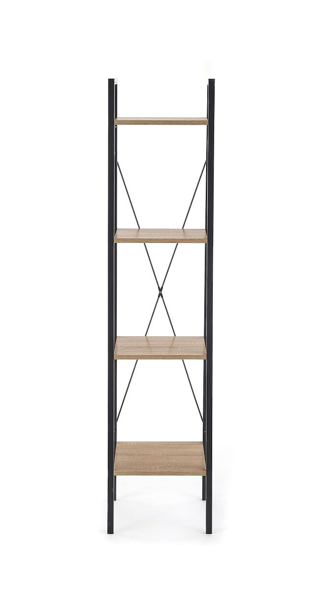 Regał składa się z czterech otwartych półek, które zapewniają przejrzystą przestrzeń do przechowywania książek, dekoracji lub akcesoriów. Półki z laminowanej płyty w dekorze dąb sonoma są uzupełnione solidną konstrukcją z malowanej proszkowo stali w kolorze czarnym, która zapewnia stabilność i podkreśla industrialny wygląd.