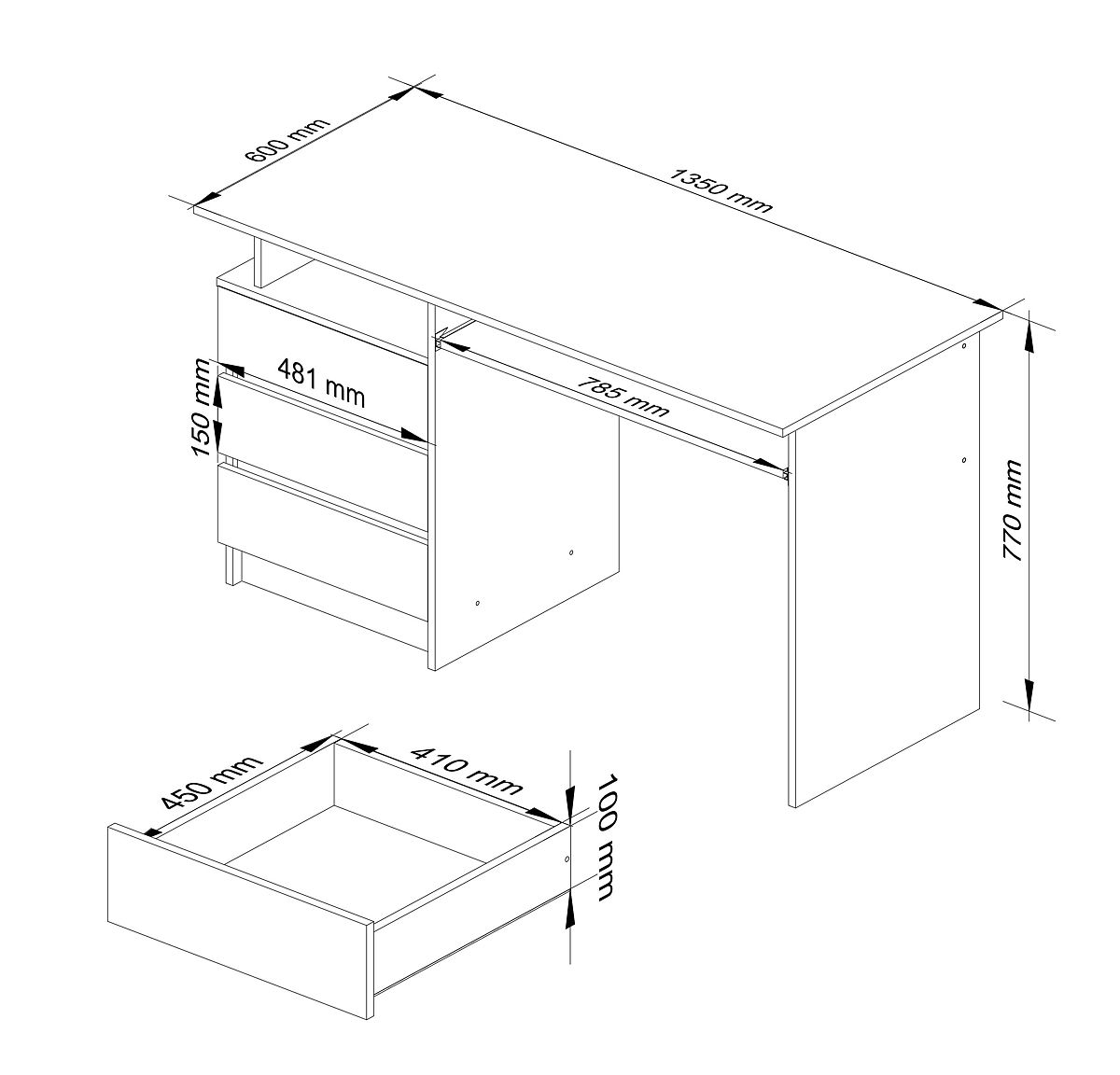 Biurko wykonane z laminowanej płyty o grubości 16 mm, odpornej na ścieranie.