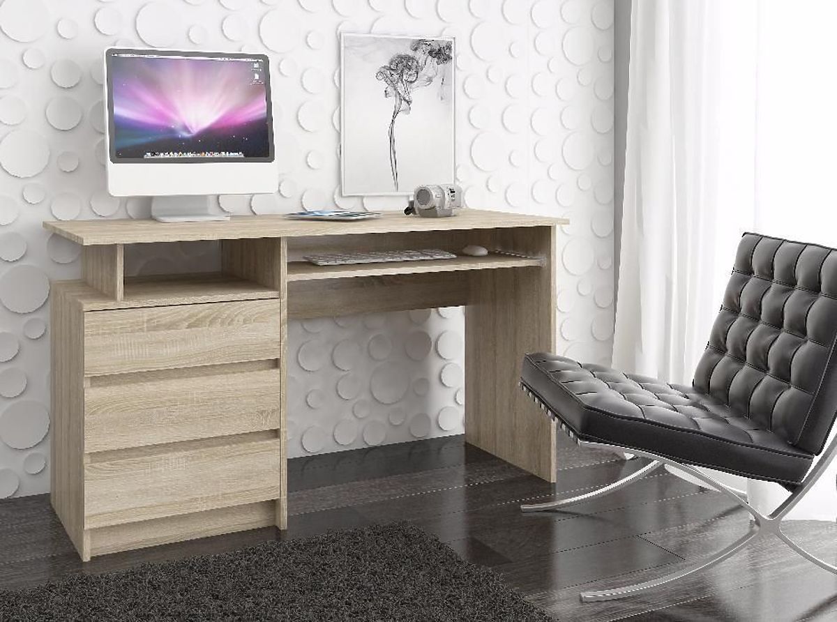 Dąb sonoma to kolor, który od dłuższego czasu cieszy się dużą popularnością. Doskonale pasuje do każdego wnętrza, dobrze komponuje się z dodatkami w różnych kolorach i łatwo się czyści. Warto zwrócić uwagę na biurko zaprojektowane w tym uniwersalnym odcieniu. Produkt został stworzony z myślą o urządzaniu biura, pokoju studenckiego lub domowego gabinetu - każdego miejsca, gdzie znajduje się komputer. Wolnostojące biurko CLP w jasnym kolorze z pewnością miło zaskoczy wysoką jakością i wyjątkowo starannym wykonaniem. Produkt charakteryzuje się solidną konstrukcją, dzięki czemu jest bardzo trwały. Szuflady, w które wyposażony jest mebel, są przestronne, co pozwala pomieścić wiele niezbędnych przy pracy biurowej akcesoriów. Wymiary mebla to 135 cm x 77 cm x 60 cm.