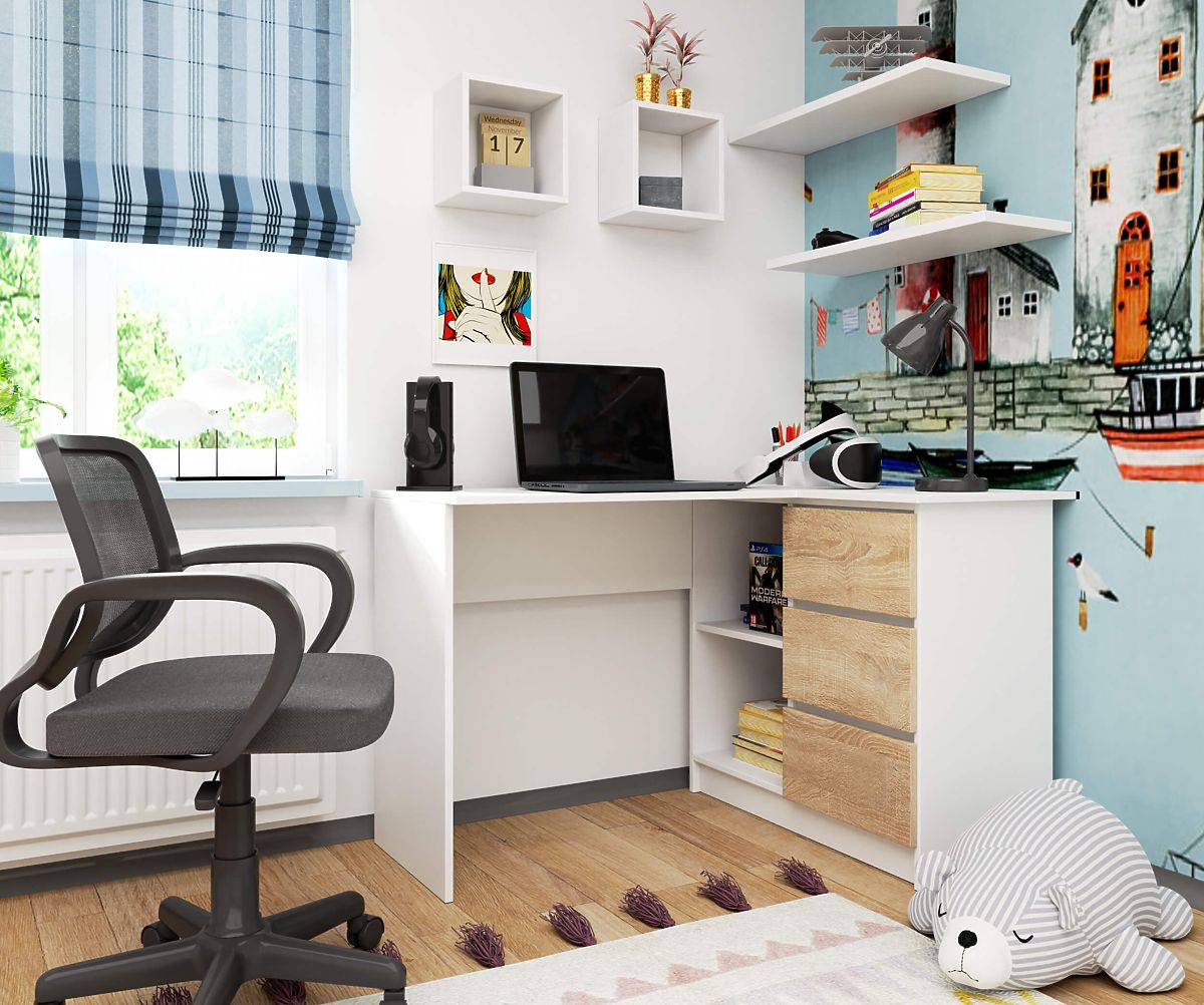Lukahome.pl » Stoły i stoliki kawowe / Biurka / NAROŻNY STÓŁ B16 124 cm PRAWY 3 SZUFLADY PK BIAŁY / SONOMA