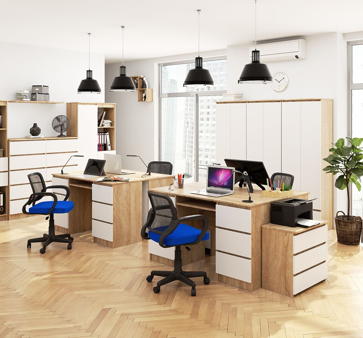 Biurko z płyty laminowanej o grubości 16 mm odpornej na ścieranie.