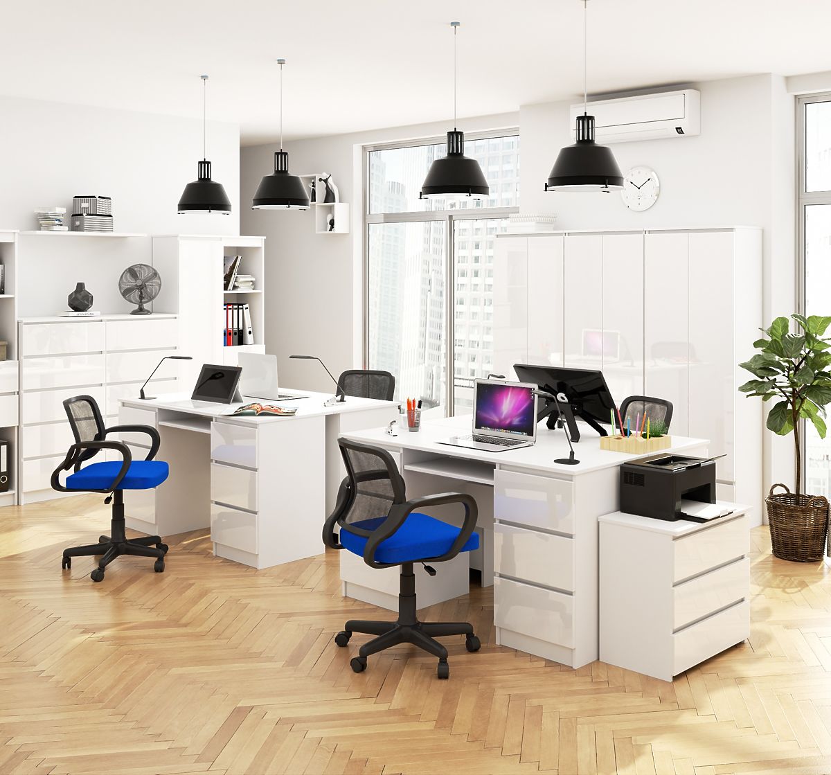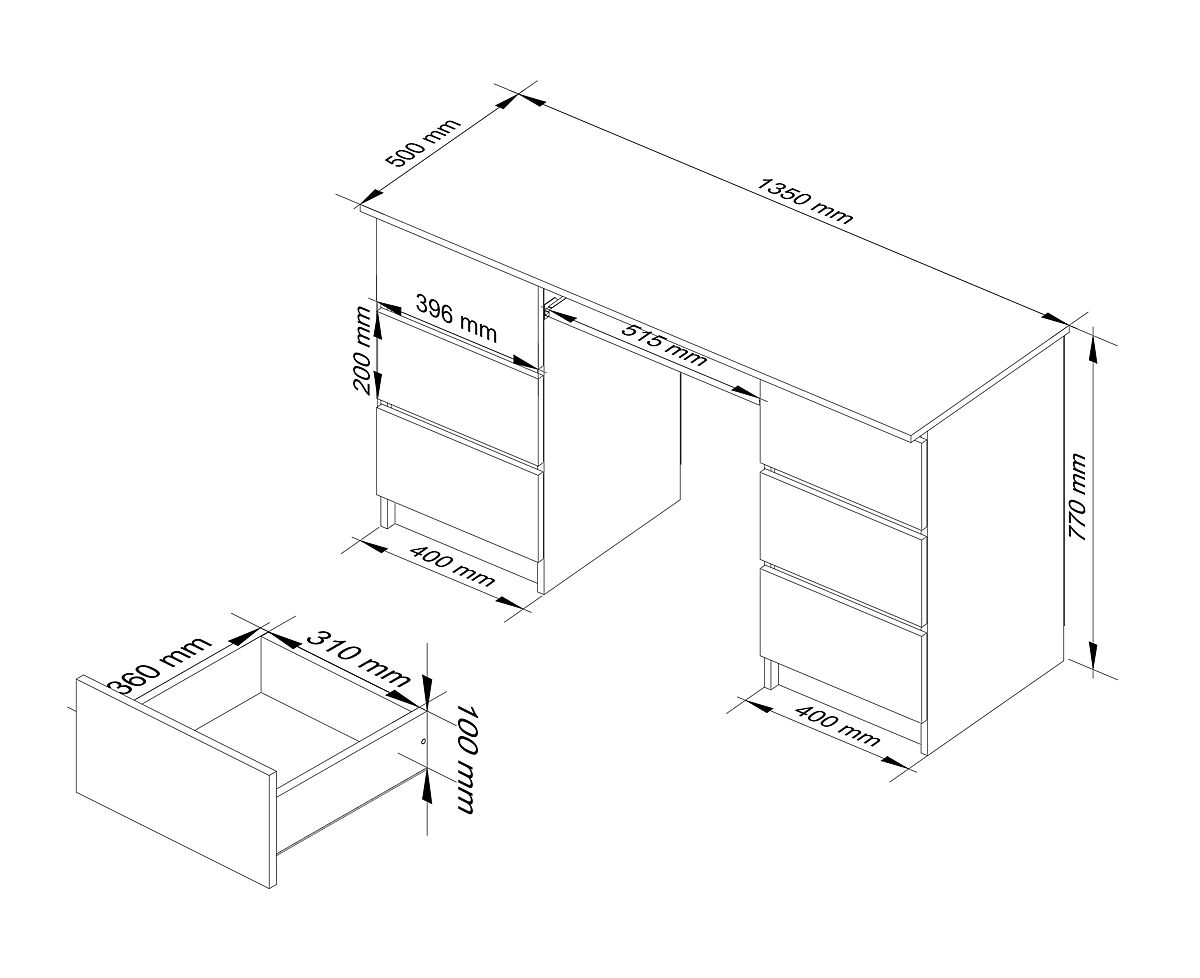 Proste, ale eleganckie biurko w białym kolorze to ponadczasowy i uniwersalny wybór, który znajdzie zastosowanie zarówno w biurze, jak i w przestrzeni mieszkalnej. Szczególnie nadaje się do domowego gabinetu, pokoju dziecięcego lub studenckiego, gdzie zapewnia wygodne i estetyczne miejsce do pracy lub nauki. Mebel wyposażony jest w praktyczną wysuwaną półkę na klawiaturę oraz sześć przestronnych szuflad, które pomieszczą wszystkie niezbędne przybory biurowe.