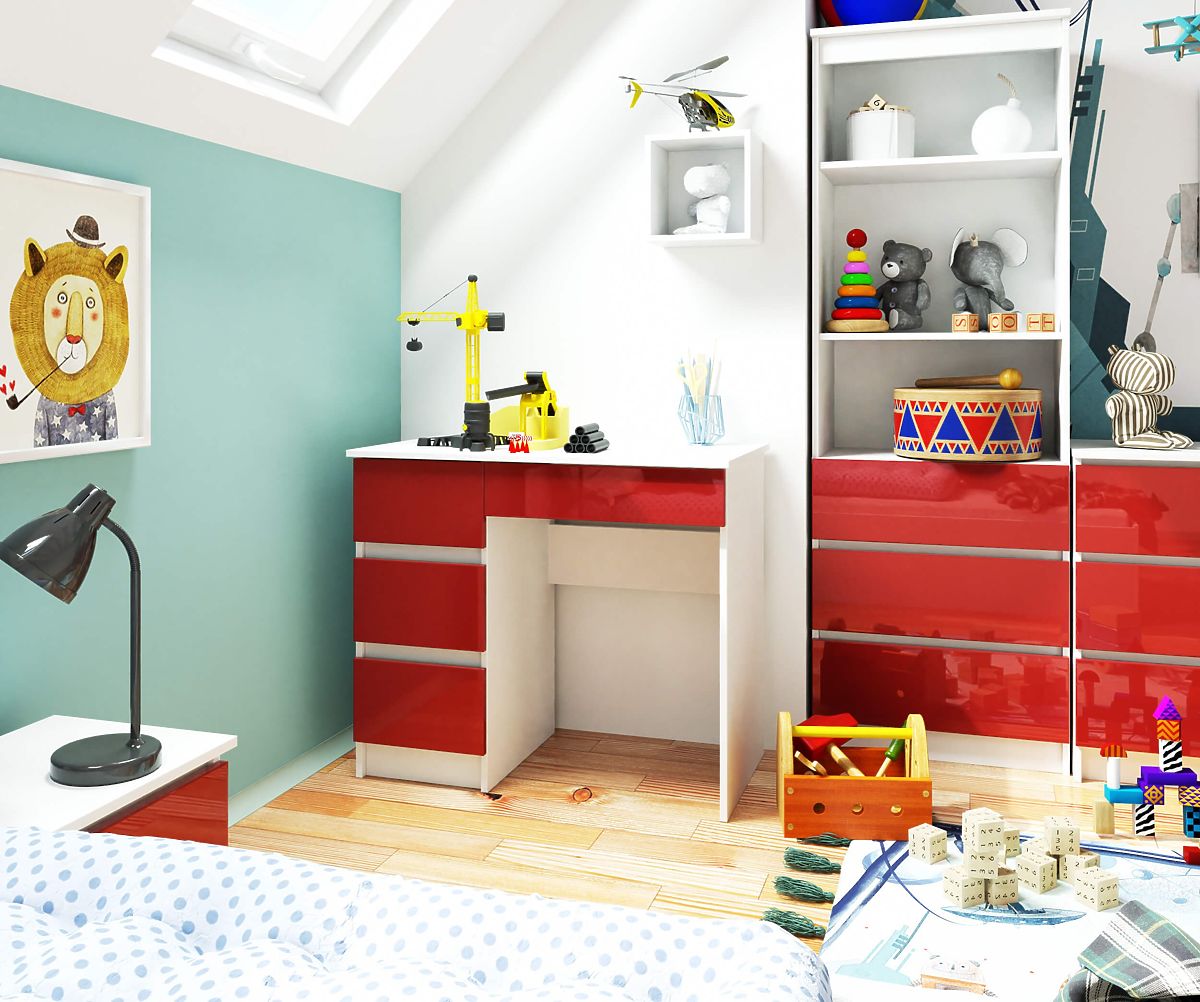 Niezwykły kolor biurka przyciąga uwagę, a jego funkcjonalność zapewnia, że produkt spełni oczekiwania nawet najbardziej wymagających użytkowników. Mebel łączy biały korpus z efektownymi czerwonymi, błyszczącymi frontami, co czyni biurko wyjątkowym. Jest to odpowiedni wybór do małych przestrzeni dzięki kompaktowym wymiarom konstrukcji. Biurko komputerowe A-7 90 cm (lewe) składa się z czterech szuflad. Znajdzie zastosowanie przede wszystkim w pokojach dziecięcych i młodzieżowych, ale także w nowocześnie urządzonych biurach.