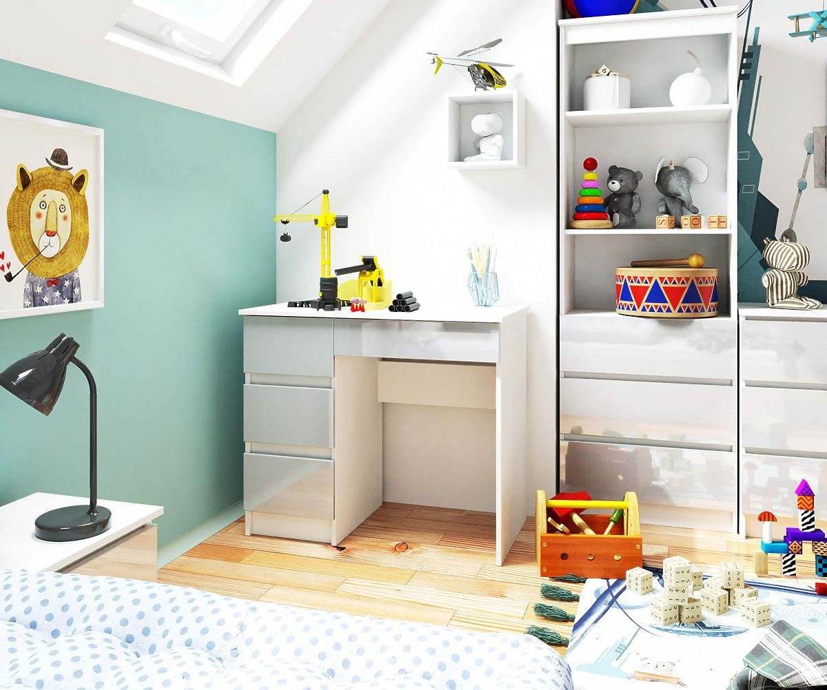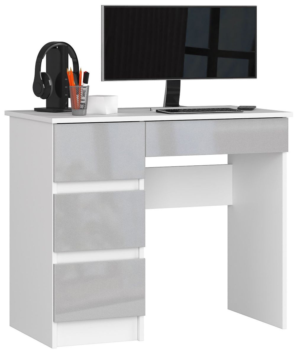 Odpowiednio dobrane biurko to klucz do efektywnej i wygodnej nauki oraz pracy. Do tych zadań doskonale nadaje się biurko komputerowe A-7! 3 przestronne szuflady o głębokości 38,5 cm umieszczone po lewej stronie świetnie nadają się jako miejsce do przechowywania notatek lub przyborów piśmienniczych, podczas gdy czwarta wysuwana pod blatem jest idealna do umieszczenia dodatkowego wyposażenia. Połączenie kolorów białego i metalicznego pozwala, aby biurko komputerowe mogło być umieszczone zarówno w biurze, jak i w kolorowym pokoju dziecięcym lub młodzieżowym, gdzie będzie stanowiło subtelny dodatek do wnętrza.